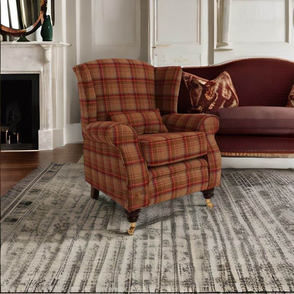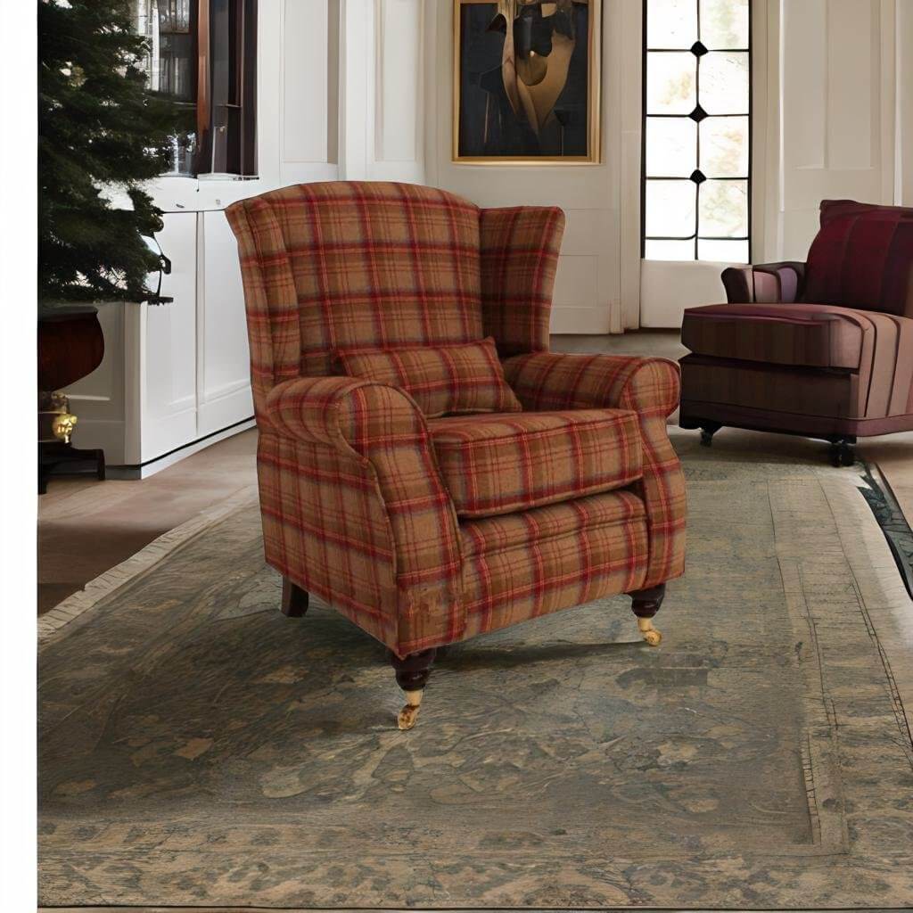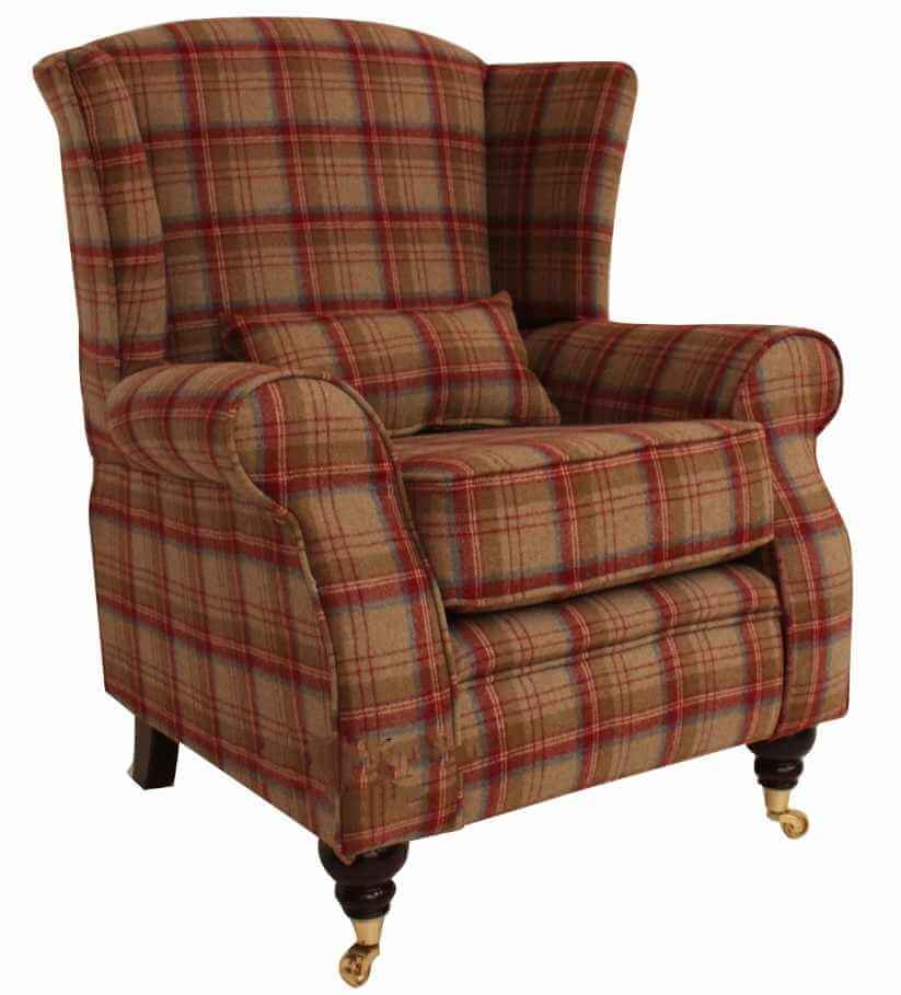 Arnold Wool Tweed Wing Chair Fireside High Back Armchair Heritage Scarlet Check Fabric