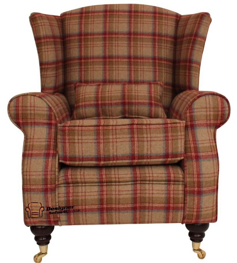 This traditionally styled wing chair has polyester fibre seat cushion and high tensile comfy cushions. Featuring hardwood Turned Mahogany Brass legs with rollers. Upholstered in Luxurious Designer Wool exclusively available from Designer Sofas4u.