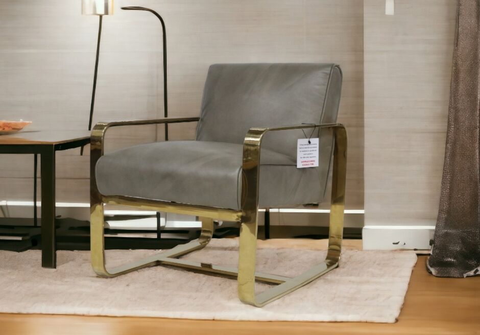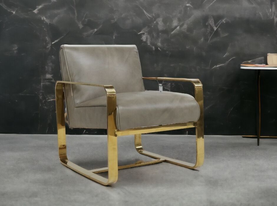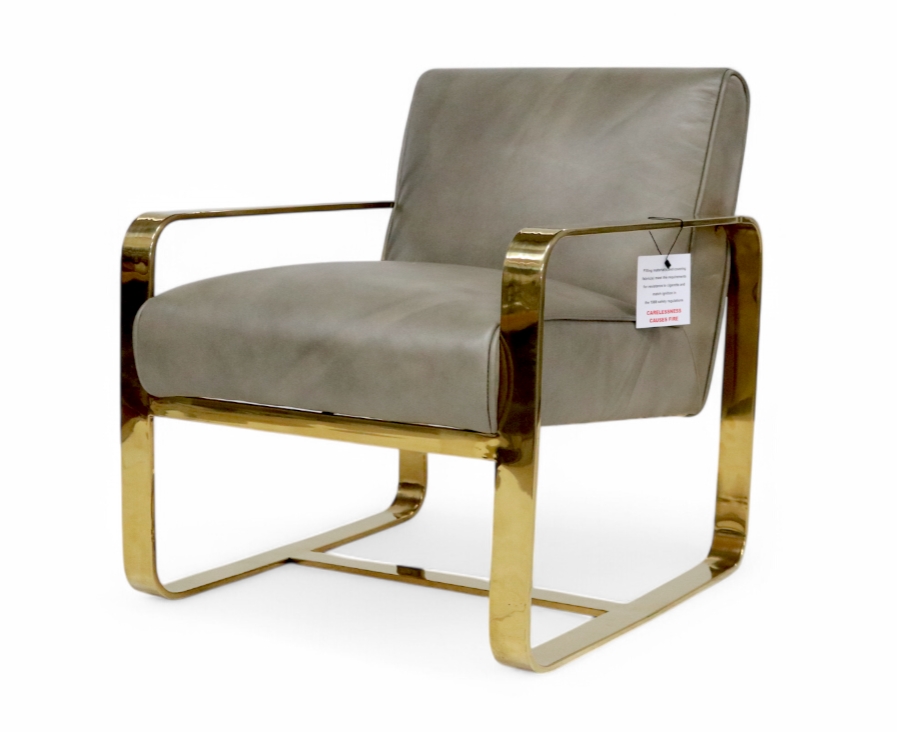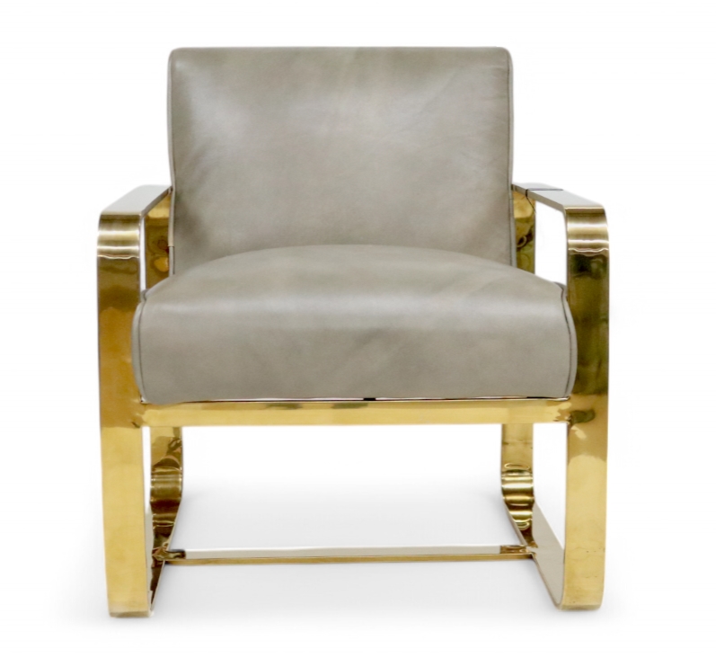Art Deco Leather and Gold Stainless Steel Armchair Wash Grey