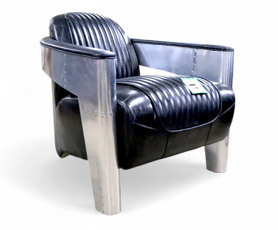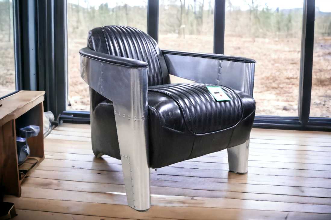 Add a bold industrial flair to your space with this stunning Vintage Aviator Armchair. Inspired by WWII fighter planes, this chair combines sleek brushed aluminum panels with riveted detailing and luxurious distressed black leather upholstery. The padded seat and backrest, accented with vertical stitching, provide both comfort and style. Ideal for man caves, lofts, offices, or anyone who appreciates unique, aviation-inspired furniture.