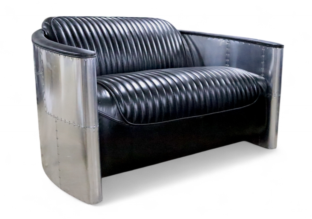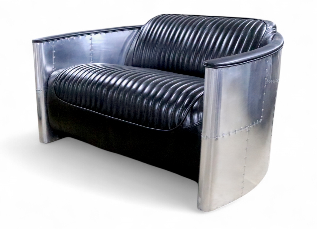 Upgrade your space with this Aviator-style 2-seater sofa, inspired by the golden age of aviation and vintage industrial design. Upholstered in premium black distressed real leather with deep ribbed stitching, this piece combines rugged luxury with sleek, masculine vibes.