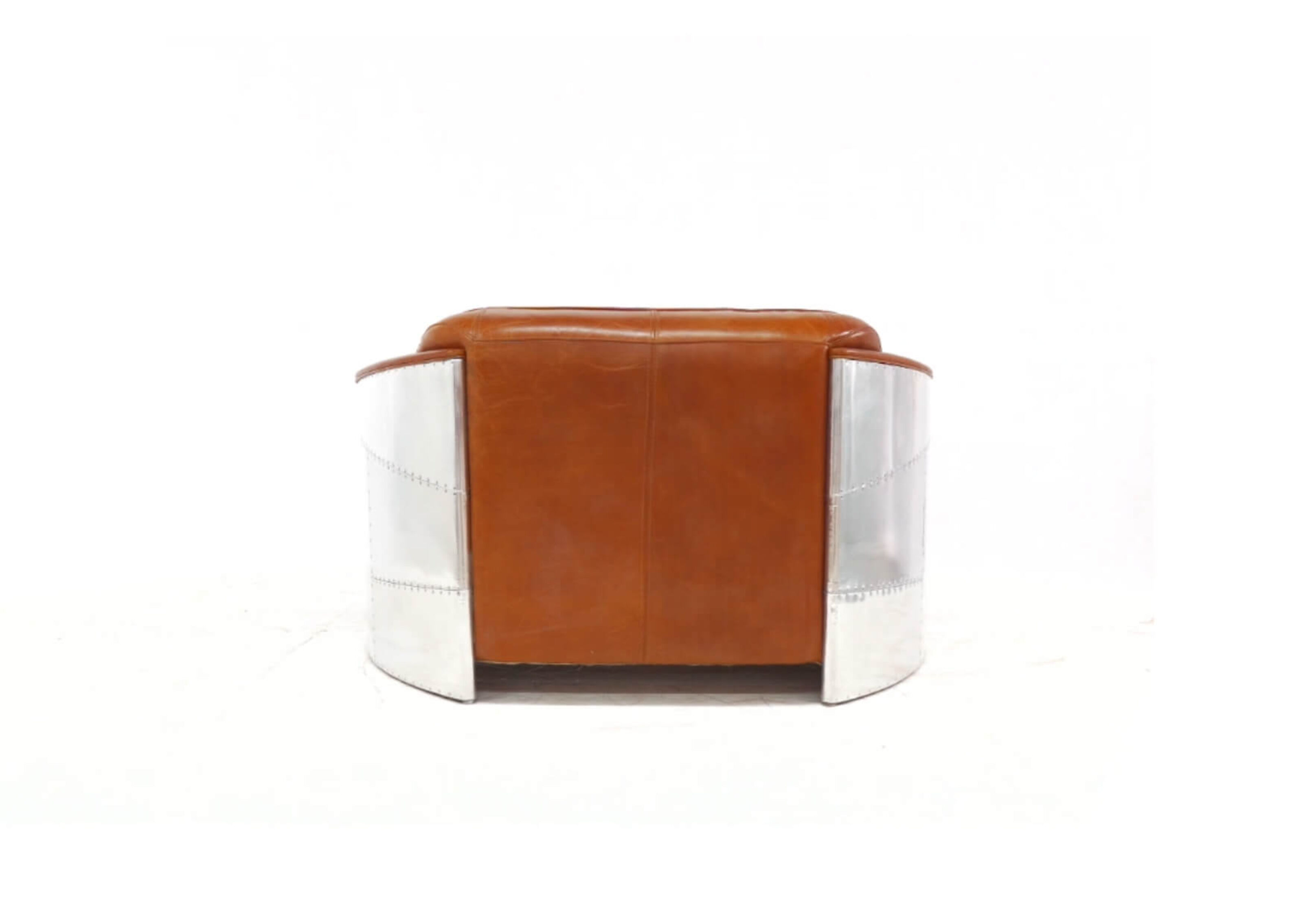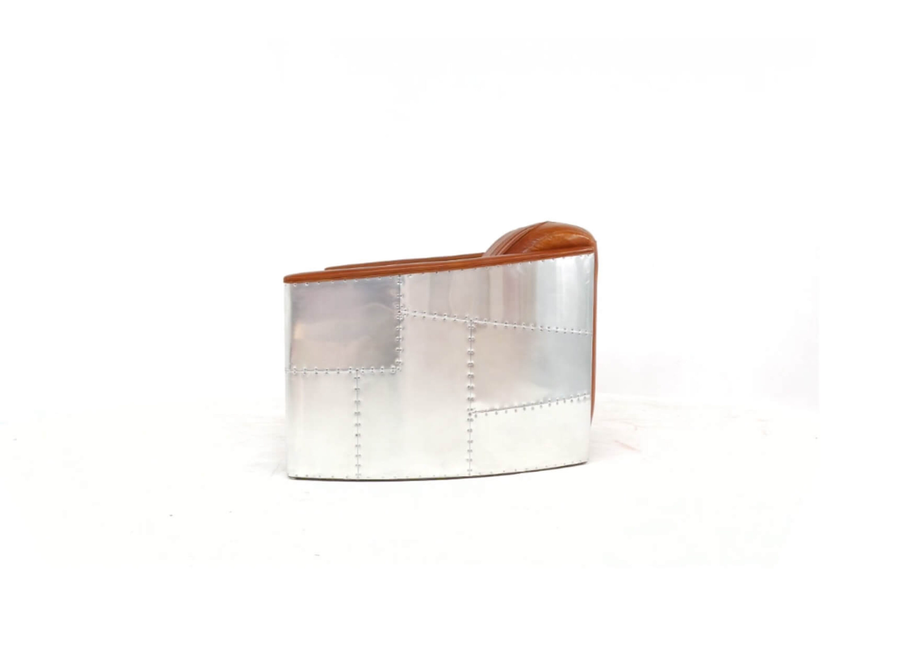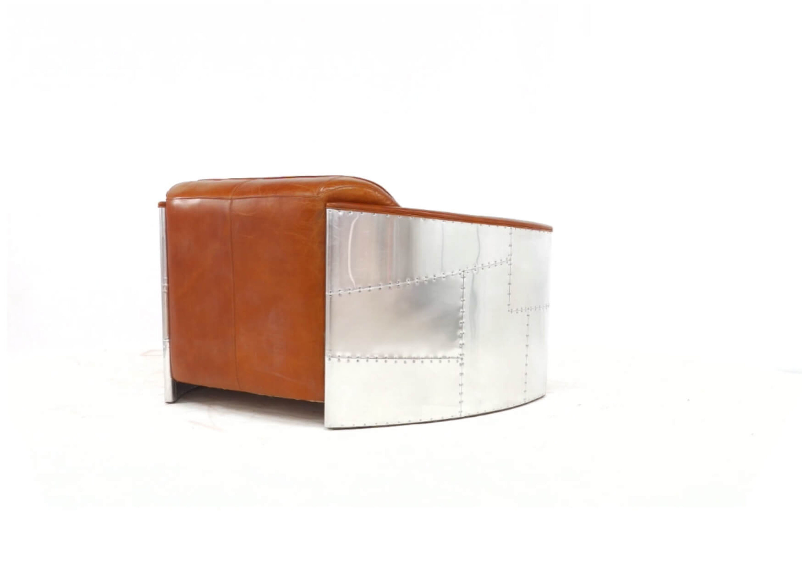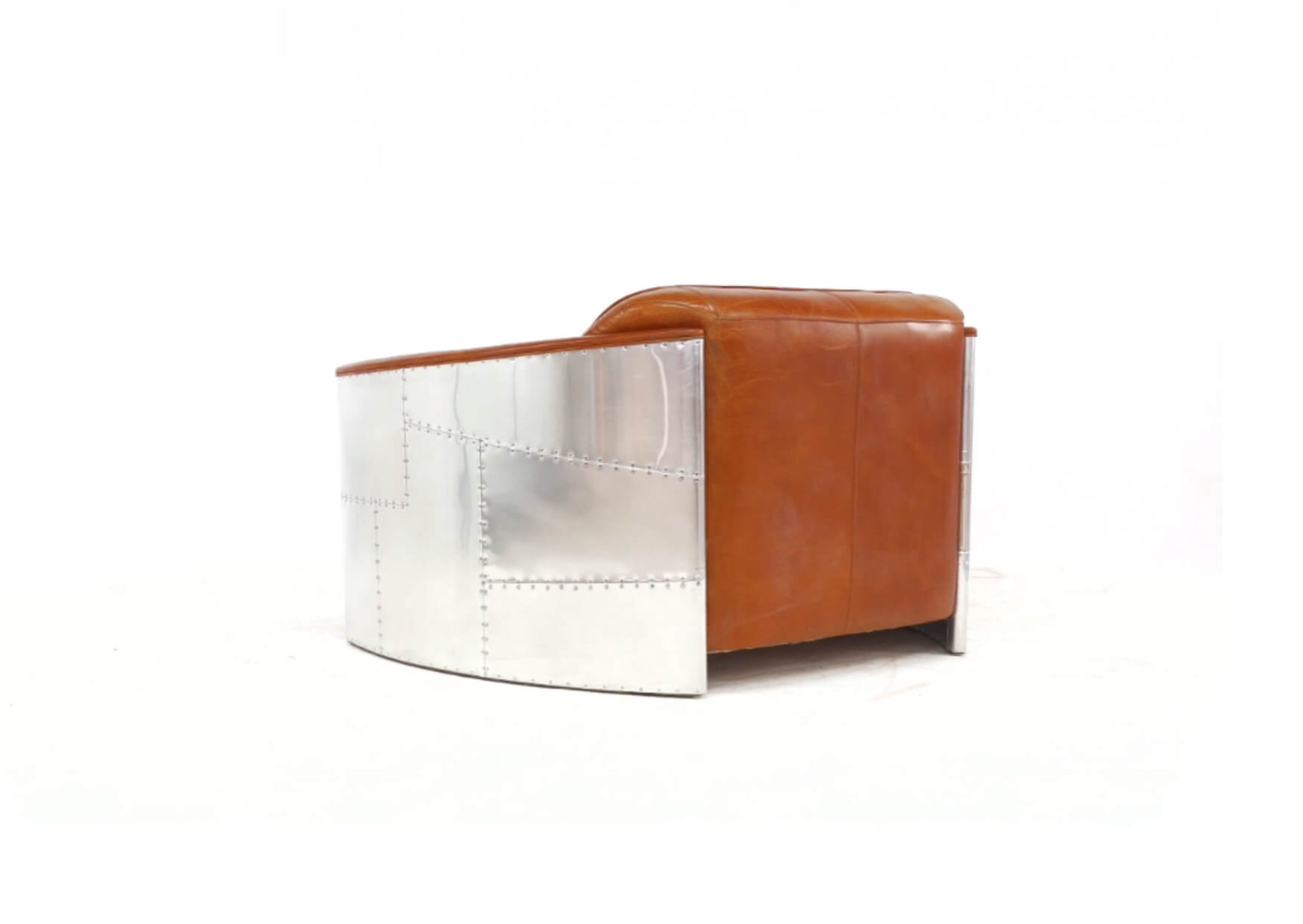 The armrests and sides are clad in riveted aluminum panels, reminiscent of WWII fighter planes, adding a sleek, metallic contrast that captures the spirit of the skies. The gently curved arms and padded structure offer both style and support, making it ideal for a study, man cave, office, or modern loft.
