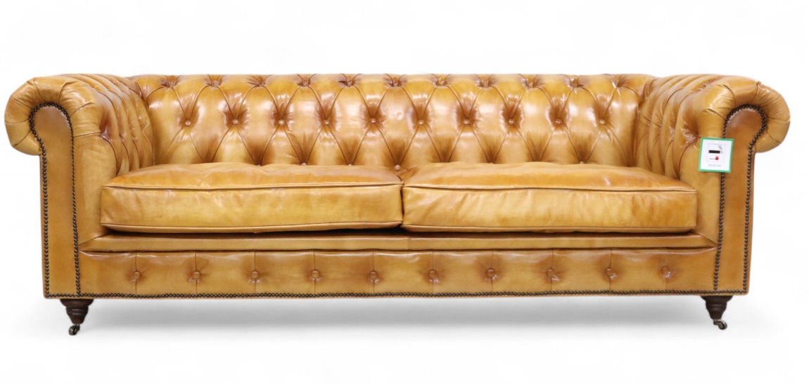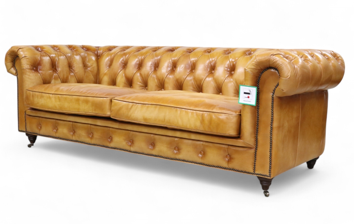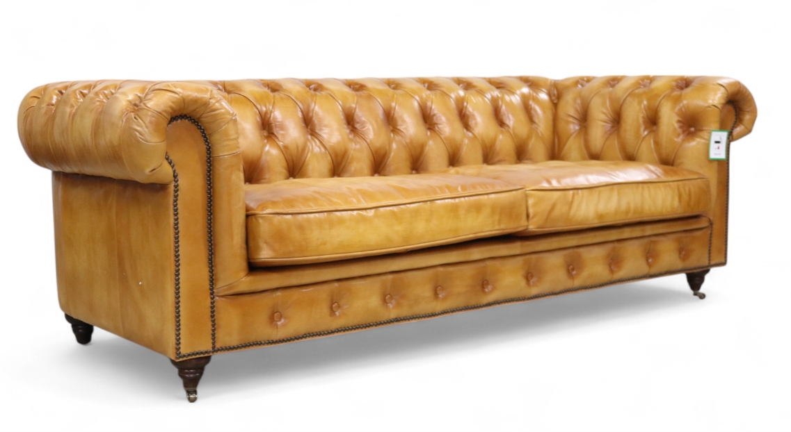 From the UK's vintage furniutre stocklist this 3 seater leather sofa combines a beautiful buttoned back and armrests, with a vintage studding in the front is available in a wide range of vintage hand washed colours