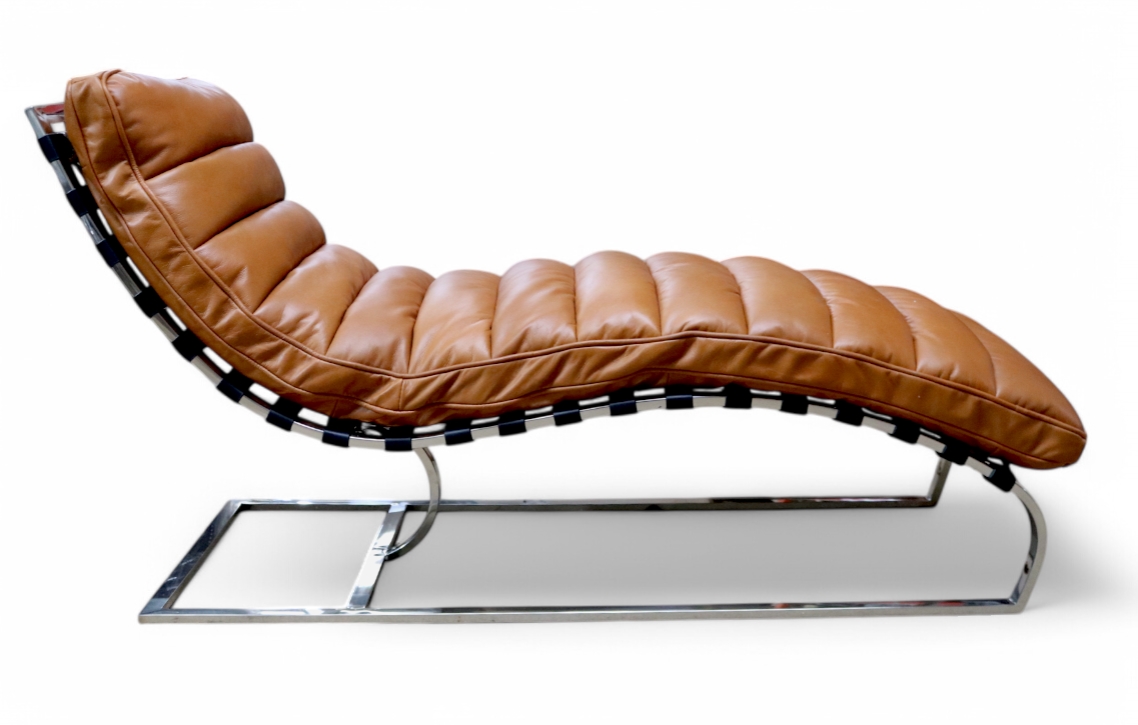 Elevate your interior with this stunning vintage orange brown leather chaise lounge, inspired by the timeless Bilbao daybed design. Featuring luxuriously padded channel-tufted leather and a sleek polished steel frame, this piece combines comfort and style in perfect harmony.