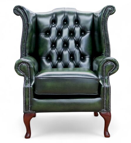 Rub Off Antique Green Chesterfield Queen Anne High Back Wing Chair | DesignerSofas4U