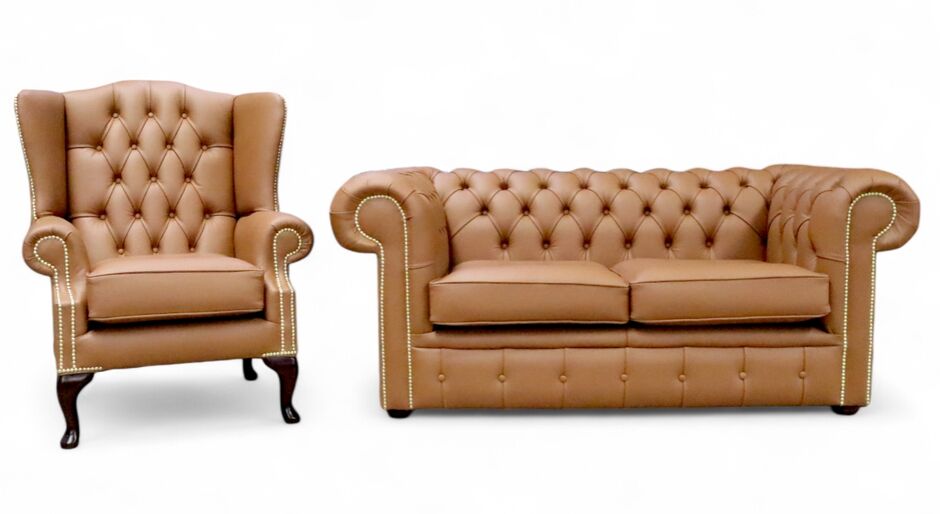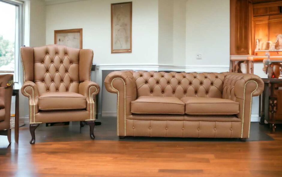 Buy Chesterfield 2 Seater and Mallory Wing chair | Old English Tan Leather|DesignerSofas4U