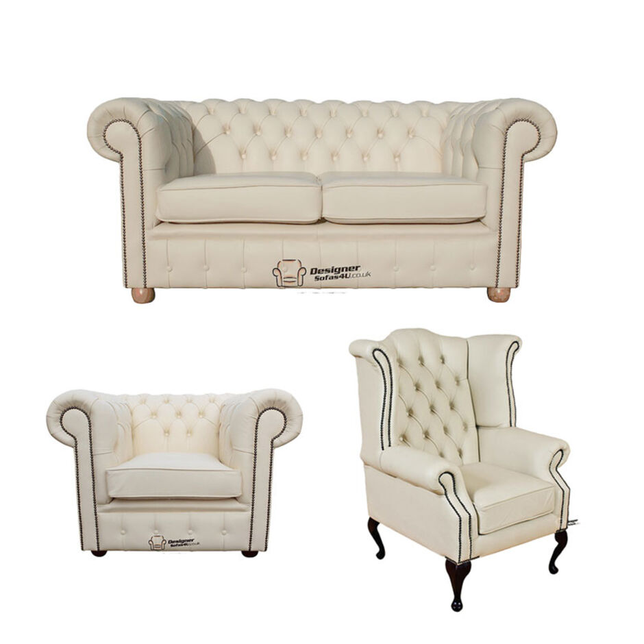 Luxury Ivory Chesterfield Leather Sofa Suite – 2-Seater Sofa + 2 Queen Anne Armchairs