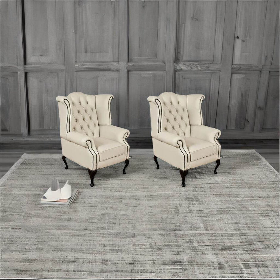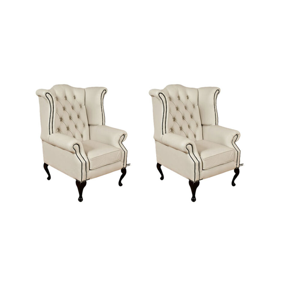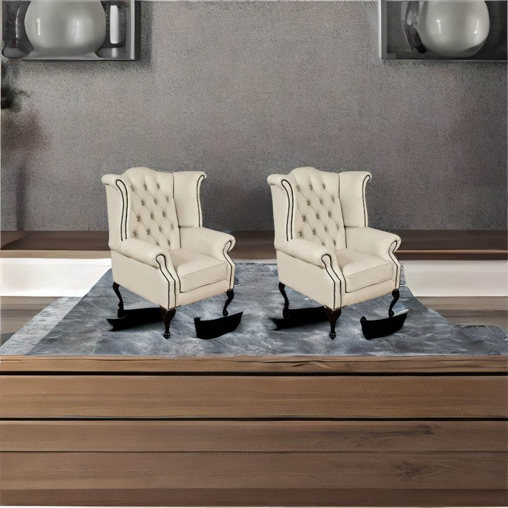 Elevate your living space with this elegant pair of Chesterfield Queen Anne Wingback Chairs, upholstered in luxurious ivory leather. These timeless pieces combine classic design with superior comfort, featuring deep-button tufting, high winged backs, and ornately carved wooden legs in a rich mahogany finish.