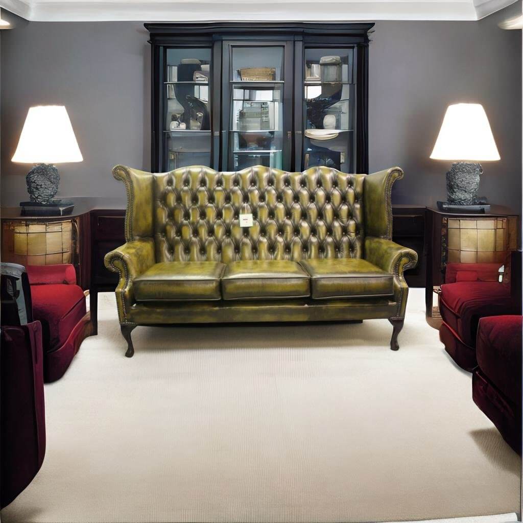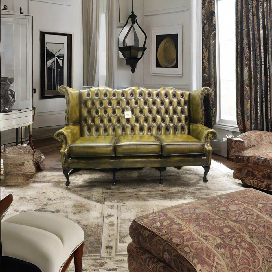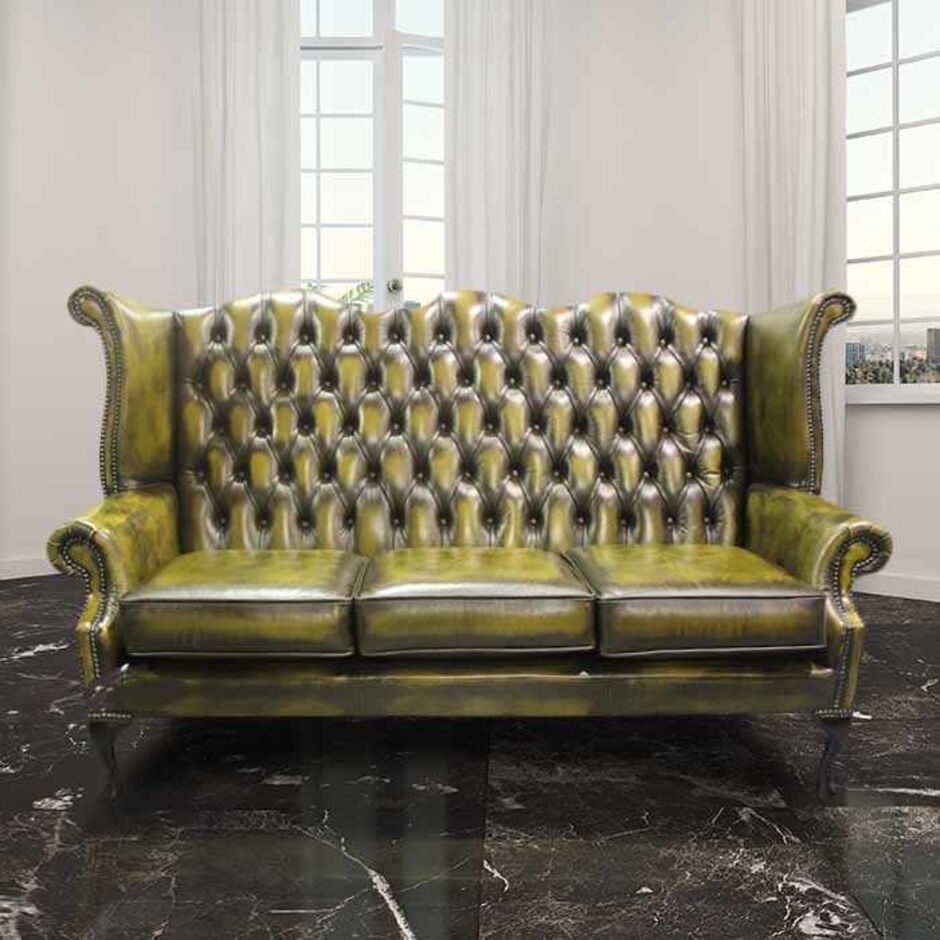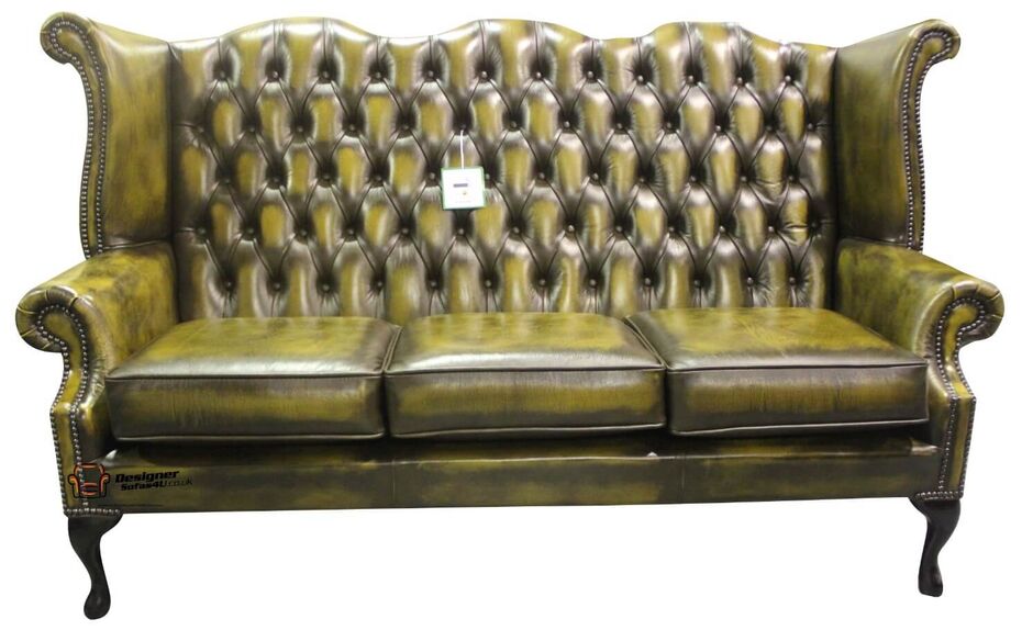 Our winged high-back Chesterfield Queen Anne Sofa with exposed hardwood leg detail. A very popular look in the Queen Anne Style