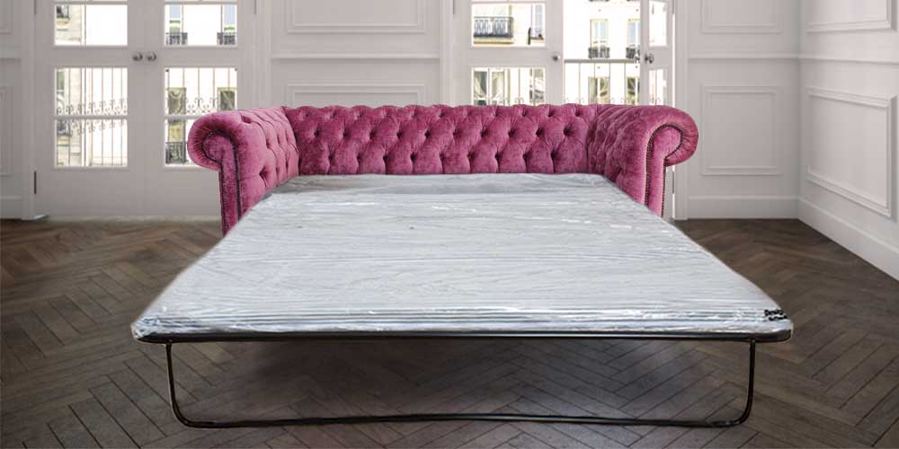 The Chesterfield Classic Sofa Bed. The Chesterfield Leather Sofa Bed with it's unique Low Back Style, Deep Buttoned Arms and Back complemented with a Buttoned Front Border. The Scroll Fronted arms on the Chesterfield Leather Sofa Bed are attractively embellished with lines of individual stud nails. An undoubted winner in any room from the cottage to the boardroom. A classic of its kind ;Traditional Vintage British Style.