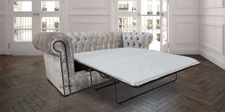 The Chesterfield Classic Sofa Bed. The Chesterfield Leather Sofa Bed with it's unique Low Back Style, Deep Buttoned Arms and Back complemented with a Buttoned Front Border. The Scroll Fronted arms on the Chesterfield Leather Sofa Bed are attractively embellished with lines of individual stud nails. An undoubted winner in any room from the cottage to the boardroom. A classic of its kind ;Traditional Vintage British Style.