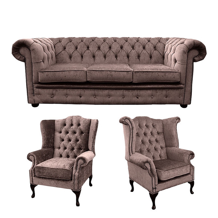 Chesterfield 3 Seater Sofa + 1 x  Mallory Wing Chair + 1 x Queen Anne Wing Chair Harmony Dusk Velvet Sofa Suite Offer