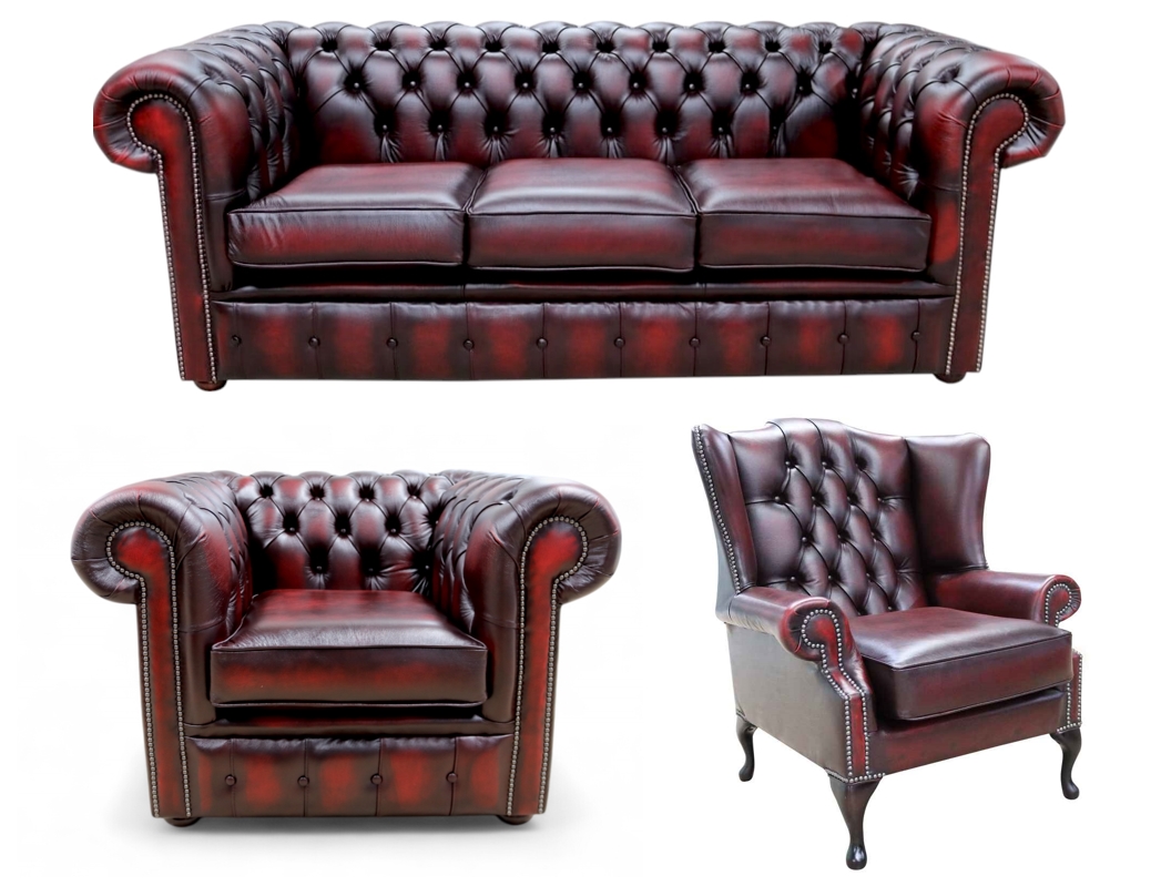 Chesterfield 3 Seater Sofa + Club Chair + Mallory Wing Chair Leather Sofa Suite Offer Antique Oxblood