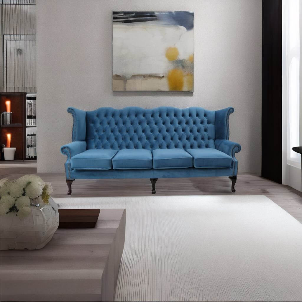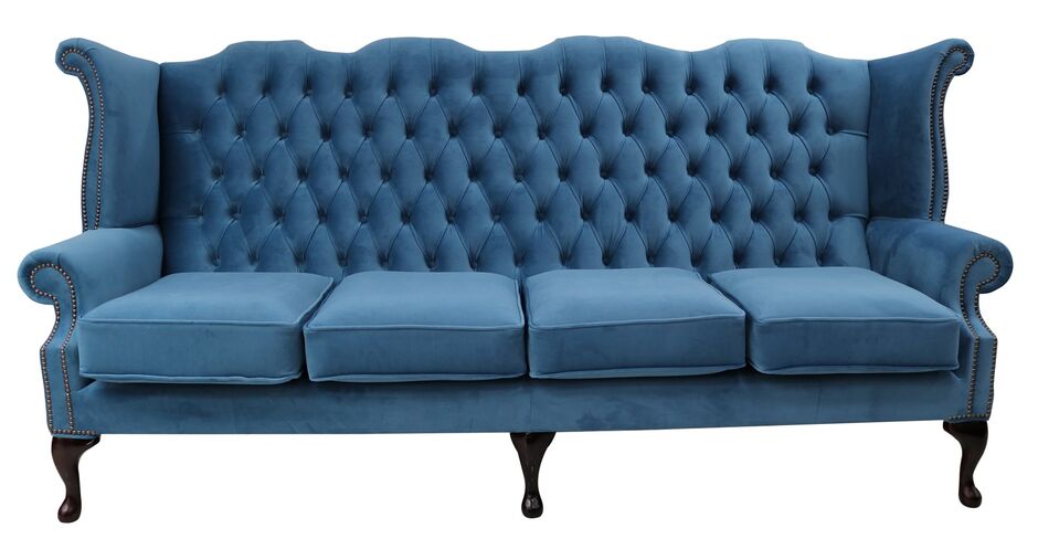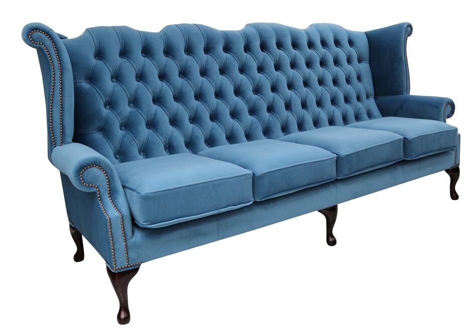 Our winged high-back Chesterfield Queen Anne Sofa with exposed hardwood leg detail. A very popular look in the Queen Anne Style