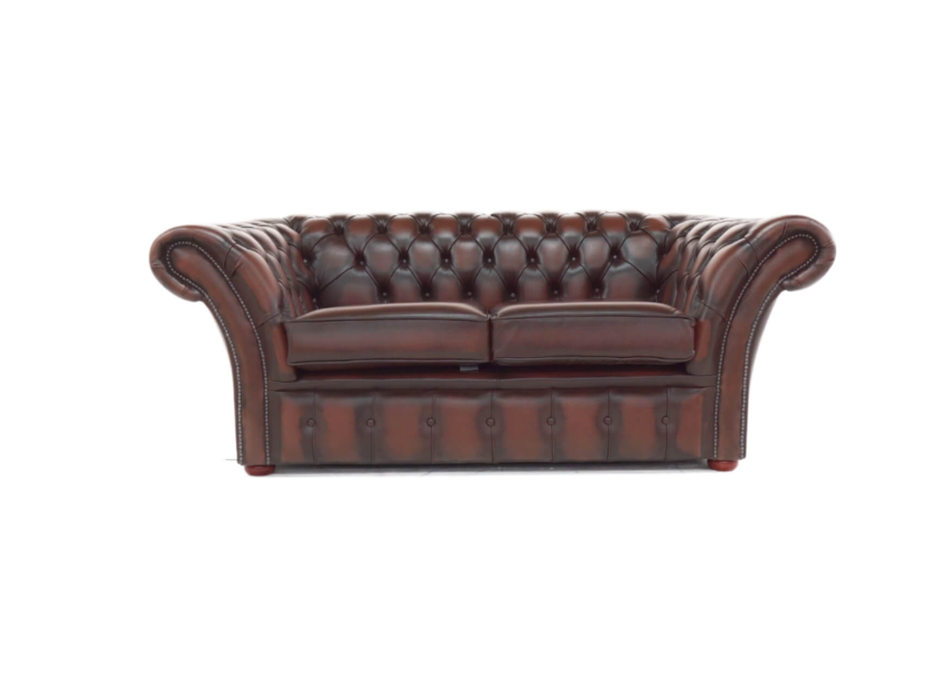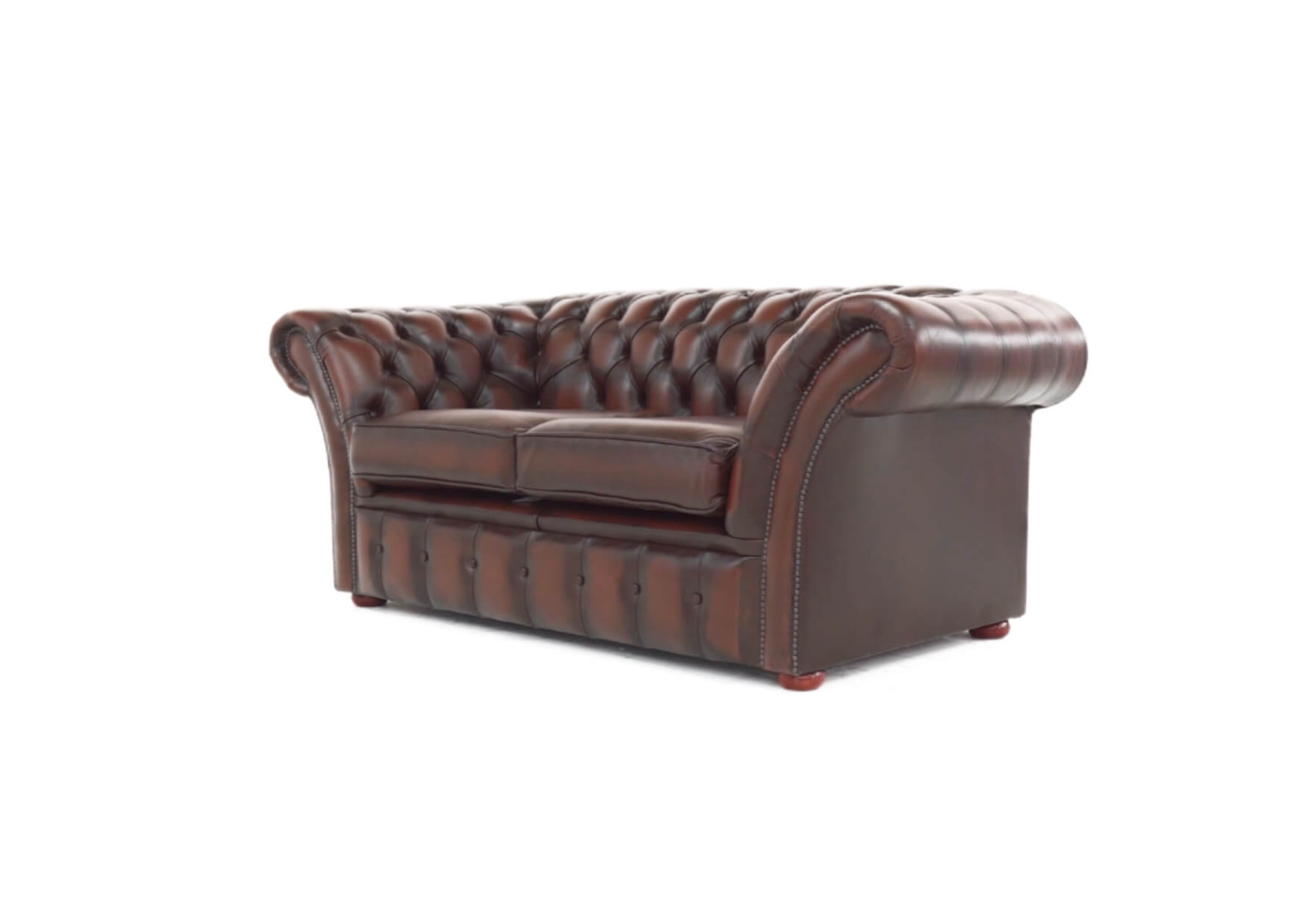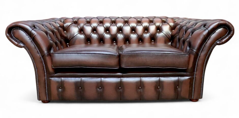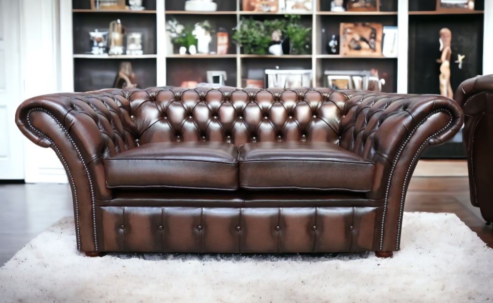 Indulge in classic sophistication with this stunning Chesterfield Balmoral 2-Seater Sofa, handcrafted in luxurious antique brown real leather. Featuring the iconic deep button-tufted backrest, scrolled arms, and double-studded detailing, this piece is the epitome of traditional British design.