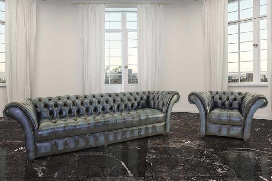 Chesterfield Balmoral 4 Seater + Armchair Button Seat Sofa Suite Antique Blue Leather