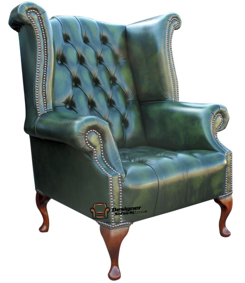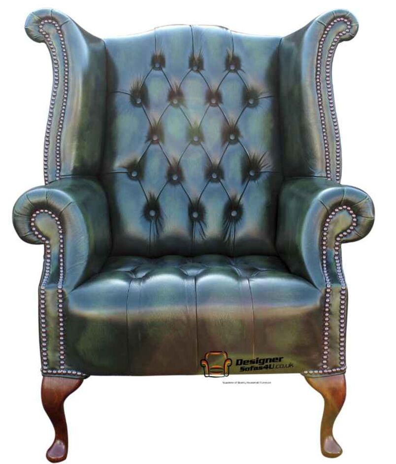 Our classic Winged High-Back Armchair with exposed hardwood leg detail. A very popular look in the Queen Anne style. High Back Chesterfield Queen Anne Wing Chair with traditional buttoned seating.