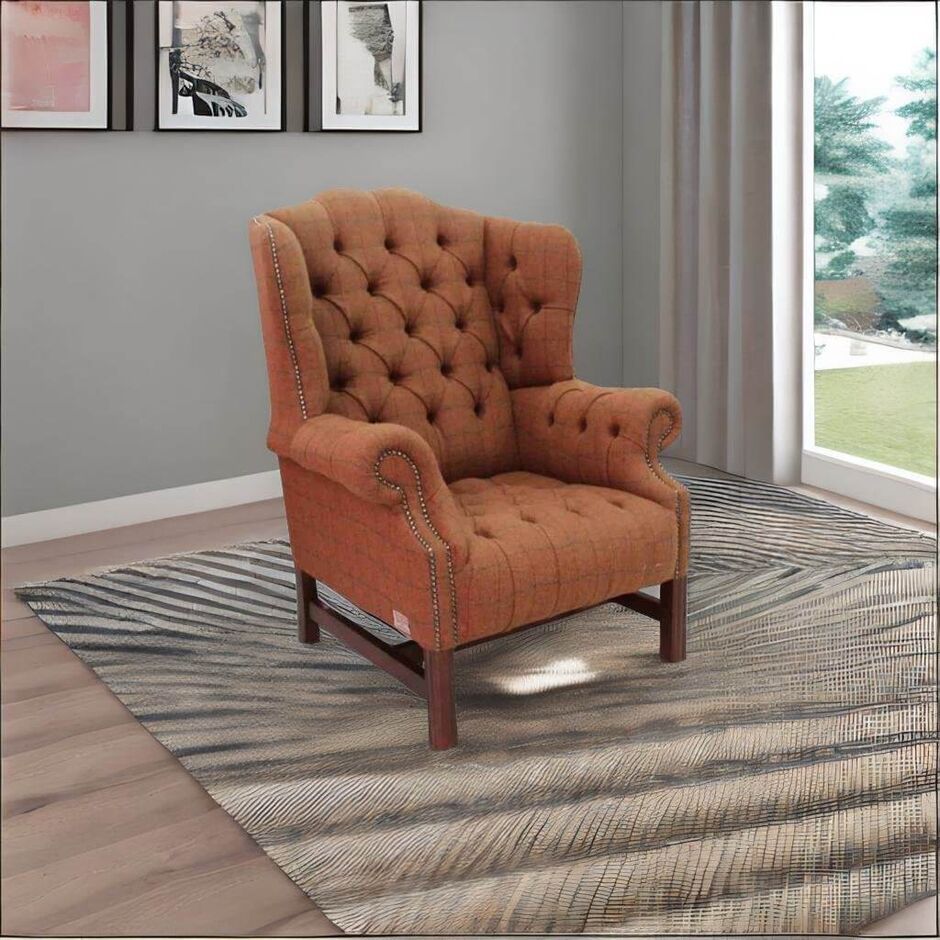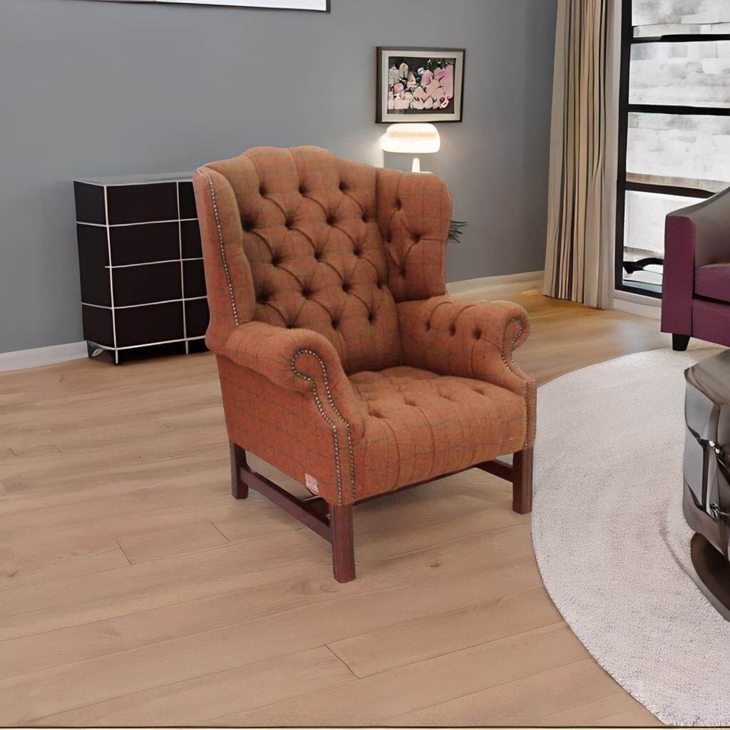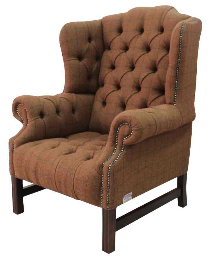 Our Vintage Chesterfield Georgian Classic Wing Chair Upholstered In Superior Harris Tweed. It features a Solid H Frame Leg.