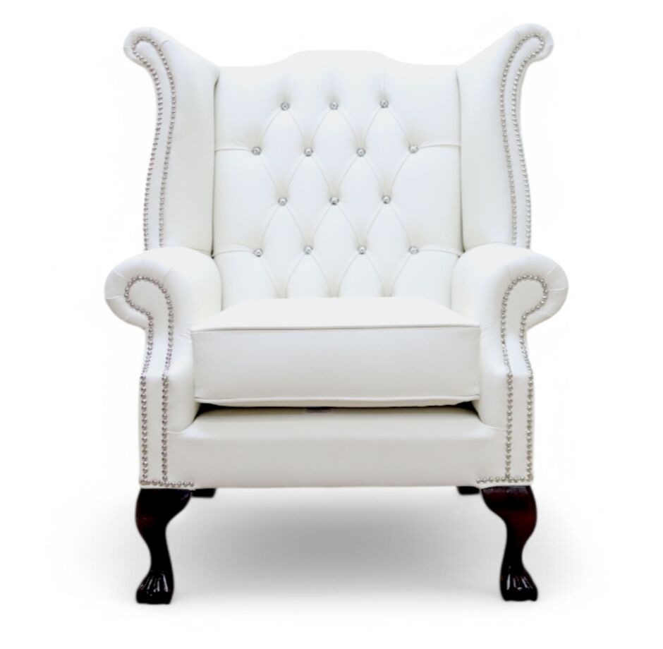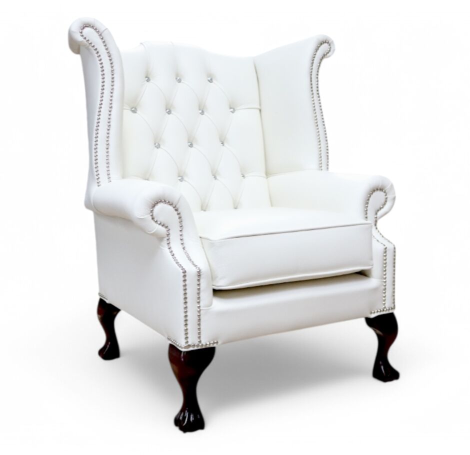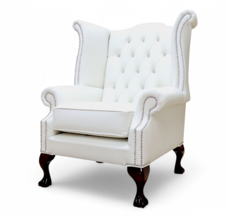Our classic Winged High-Back Chesterfield Queen Anne Armchair with exposed hardwood leg detail. A very popular look in the Queen Anne style. High Back Chesterfield Queen Anne Wing Chair