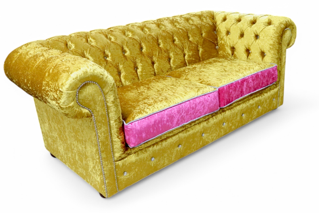 Chesterfield Crystal Diamond 3 Seater Shimmer Gold Velvet Fabric Sofa