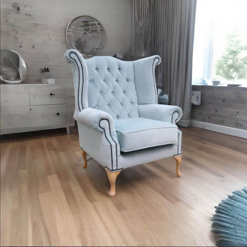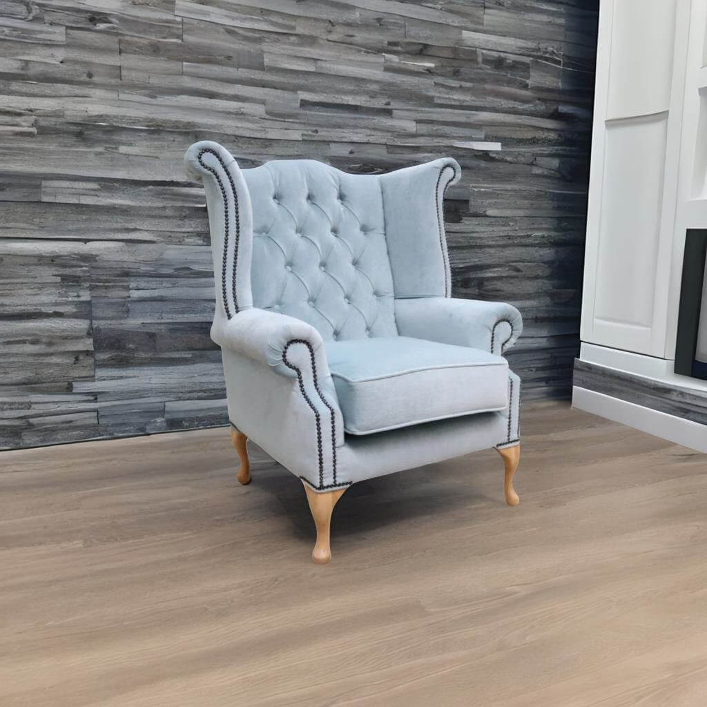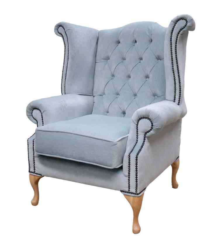 Chesterfield Velvet Queen Anne High Back Wing Chair Lustro Moonlight