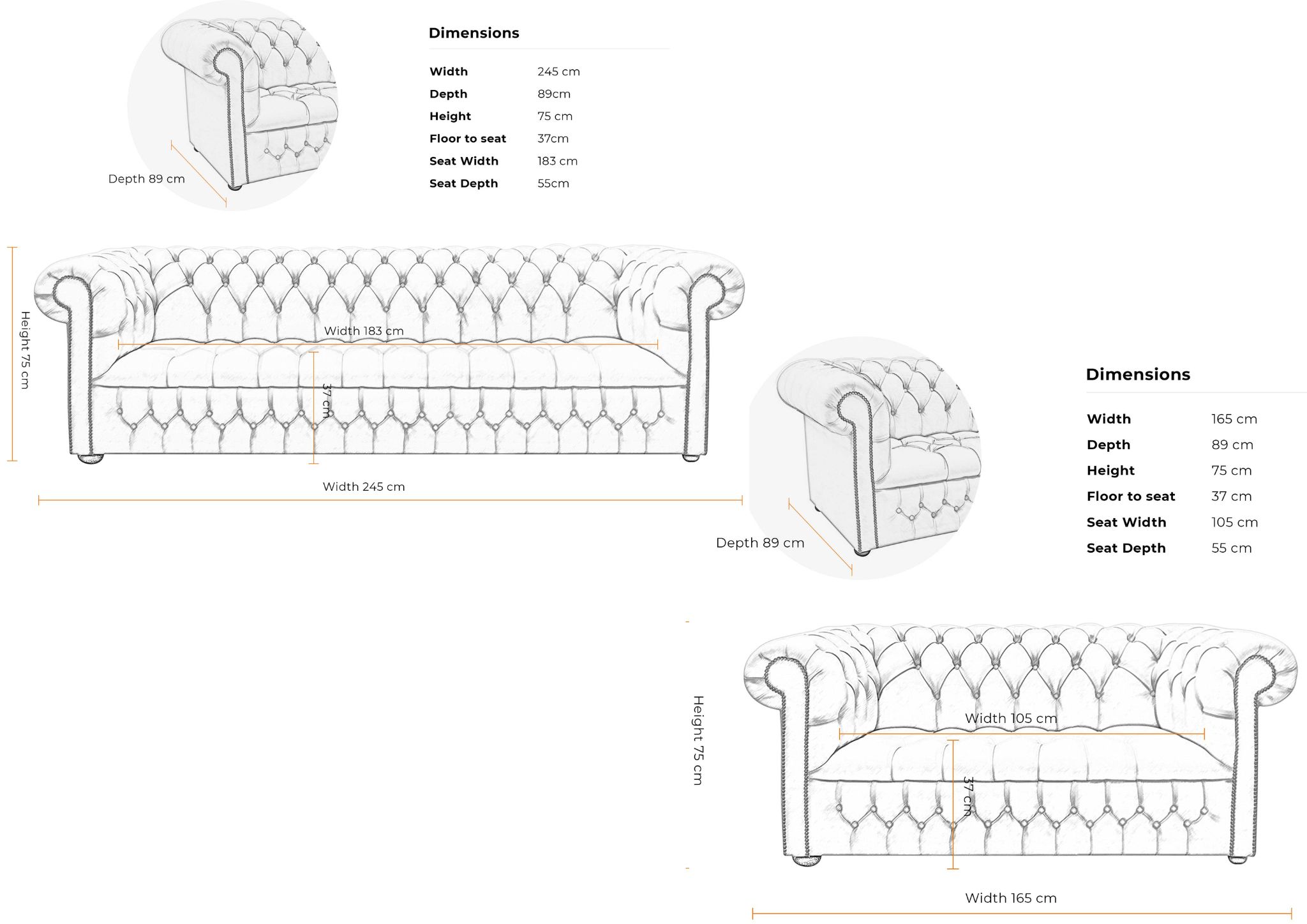 2 Seat Sofa Dimensions : H 75cm x D 89cm x W 165cm  apprx.