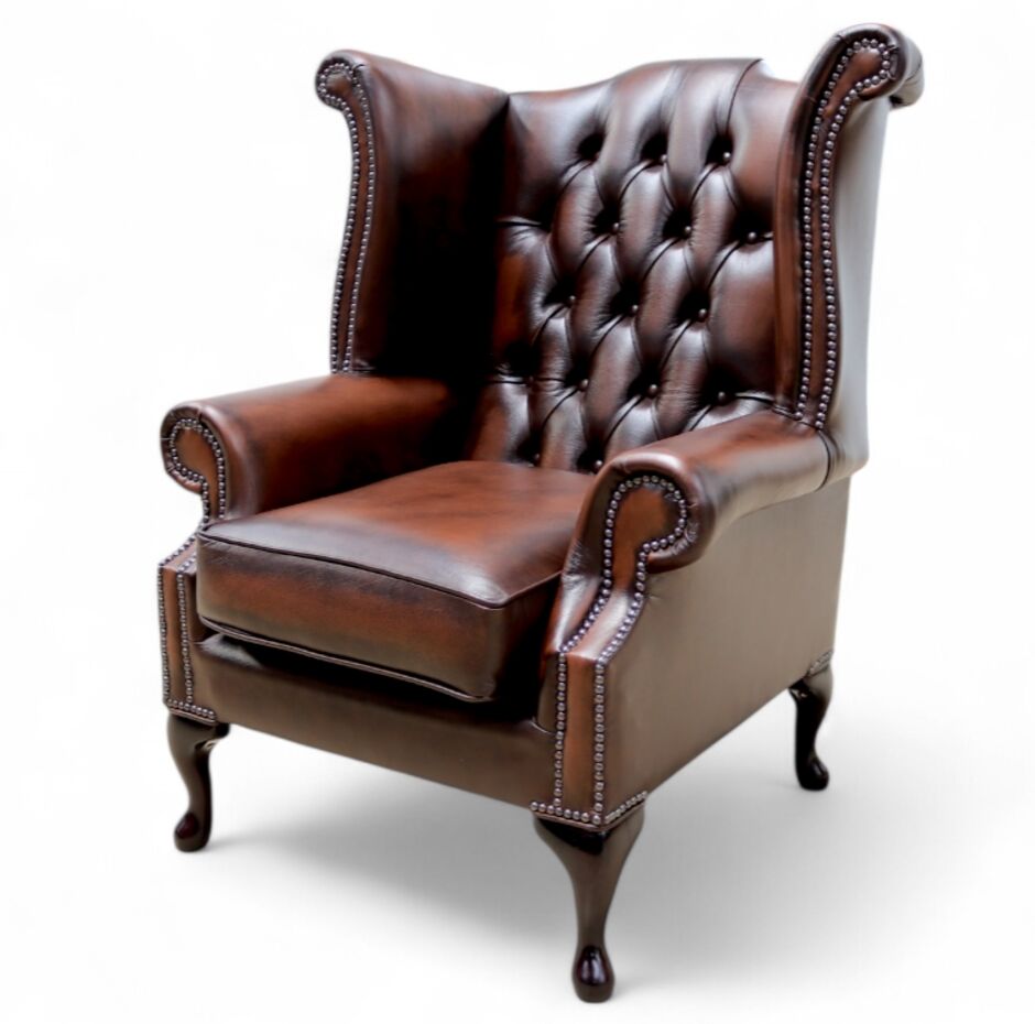 Our Winged High-Back Chesterfield Queen Anne Armchair with exposed hardwood leg detail. A very popular look in the Chesterfield style.