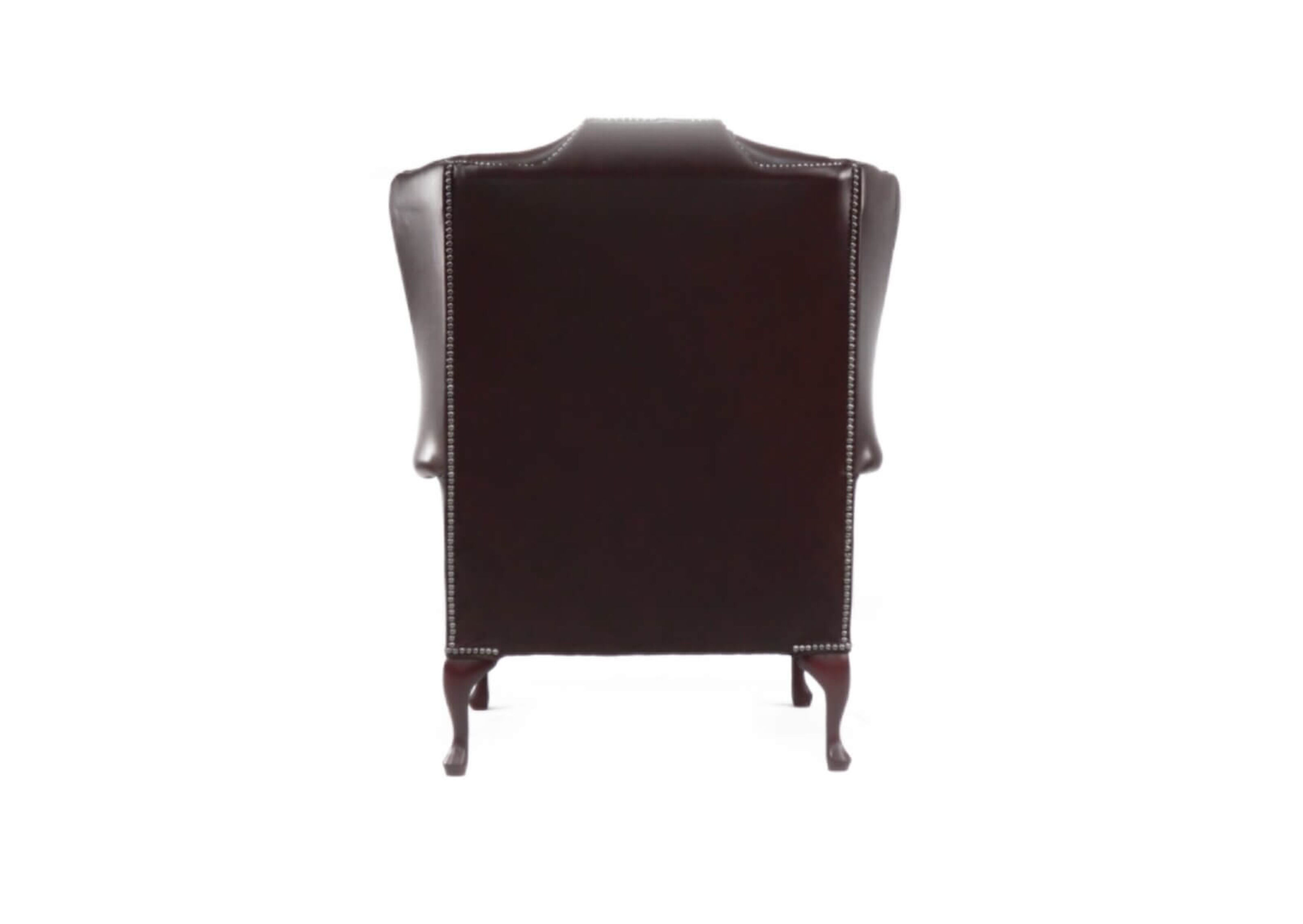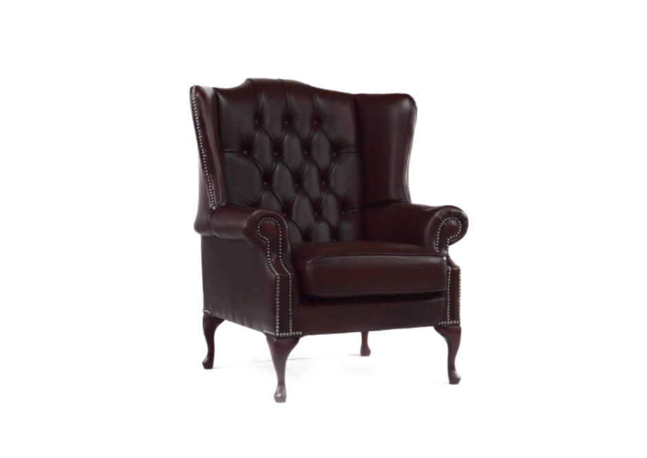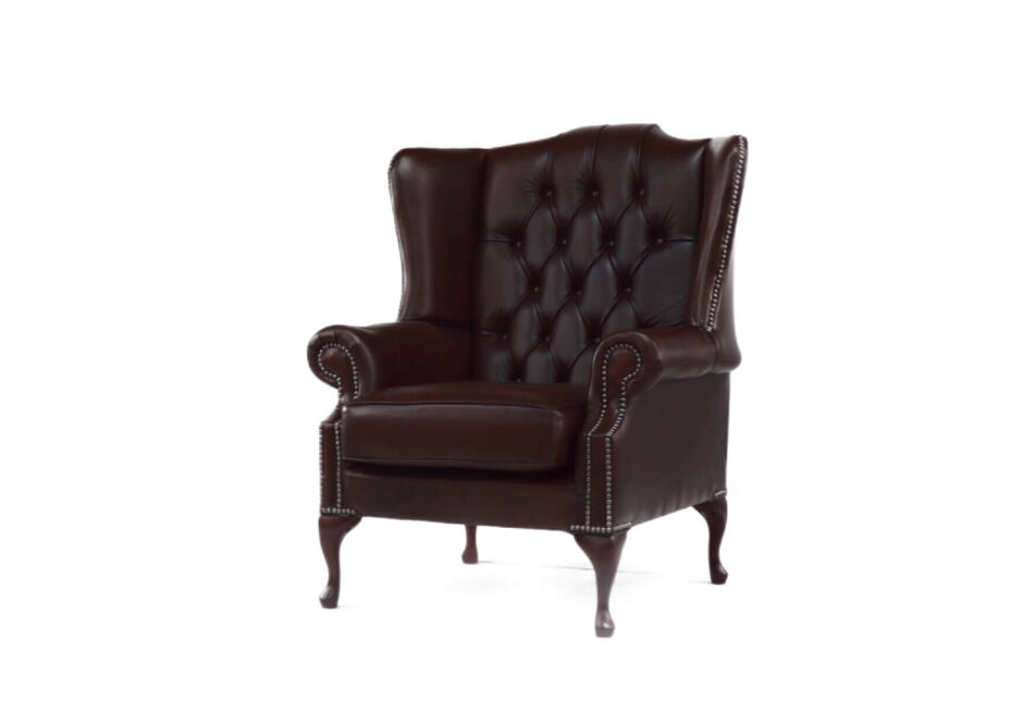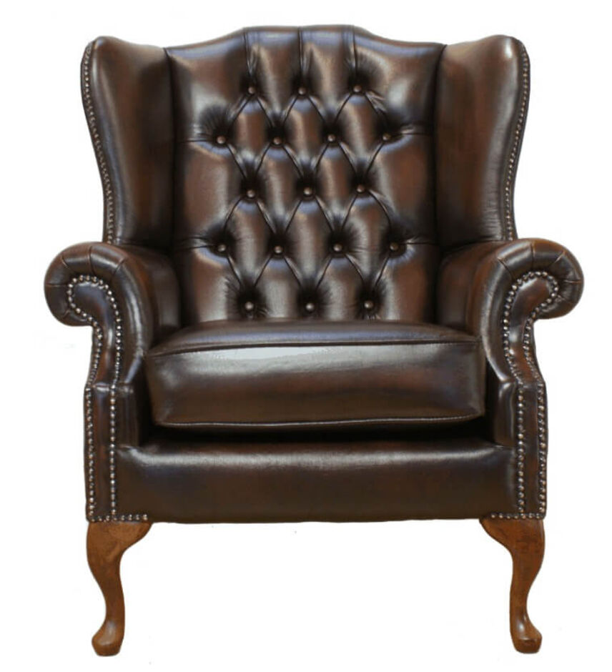 Our winged high-back Chesterfield Queen Anne Armchair with exposed hardwood leg detail. A very popular look in the Queen Anne Style