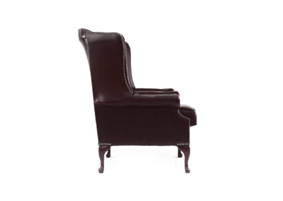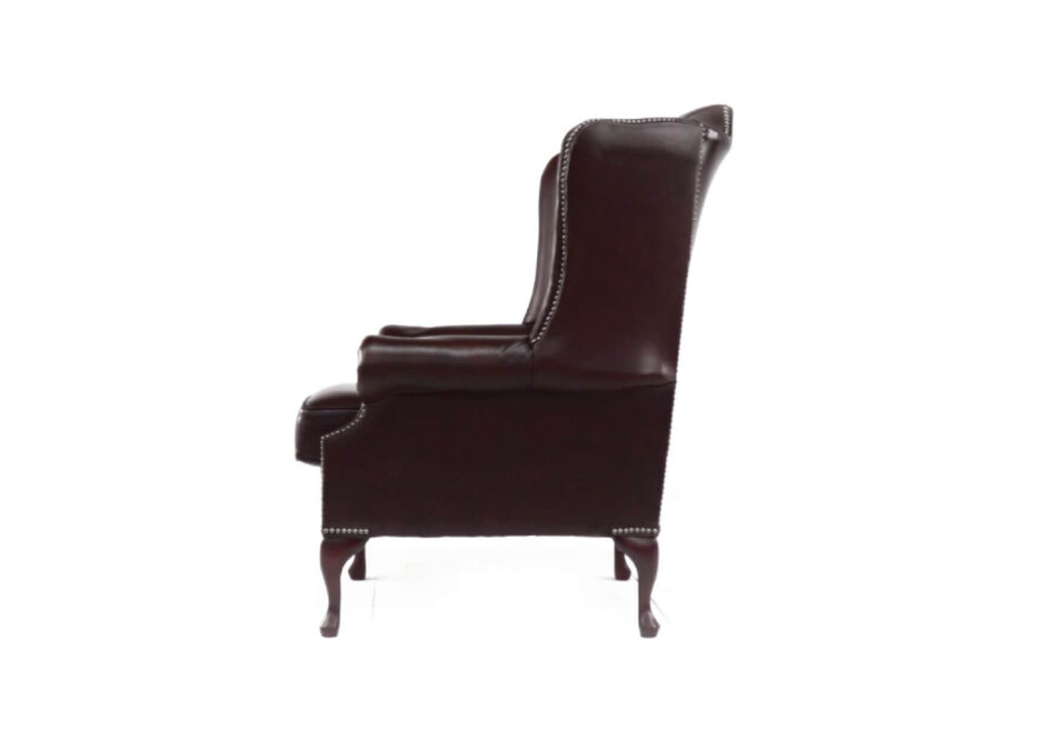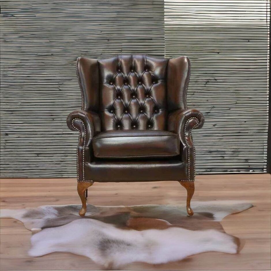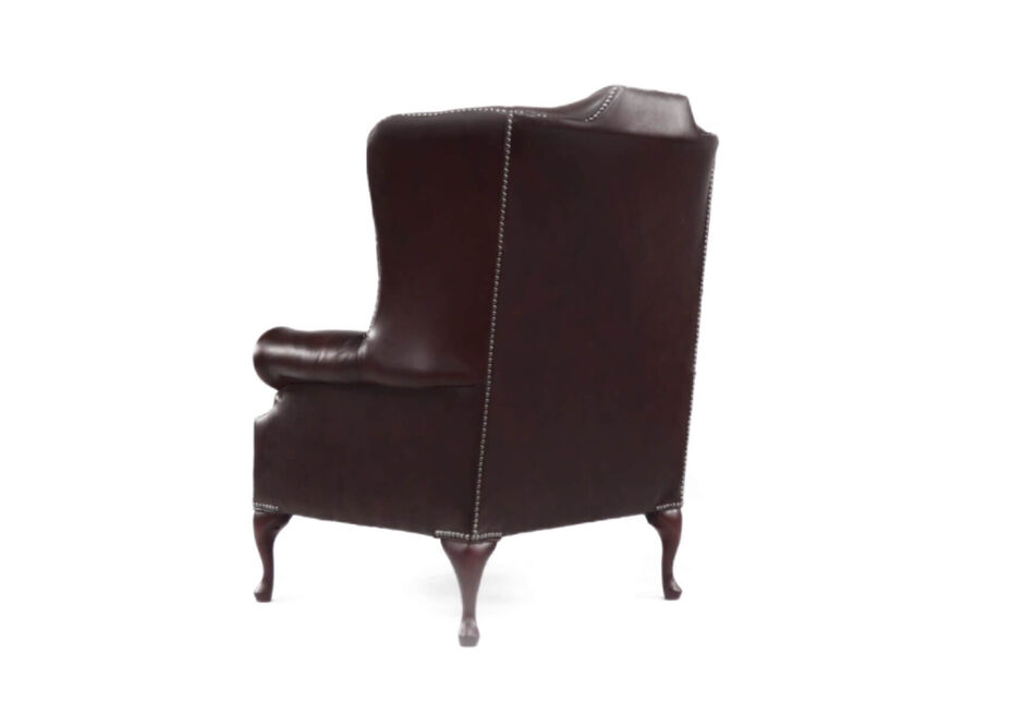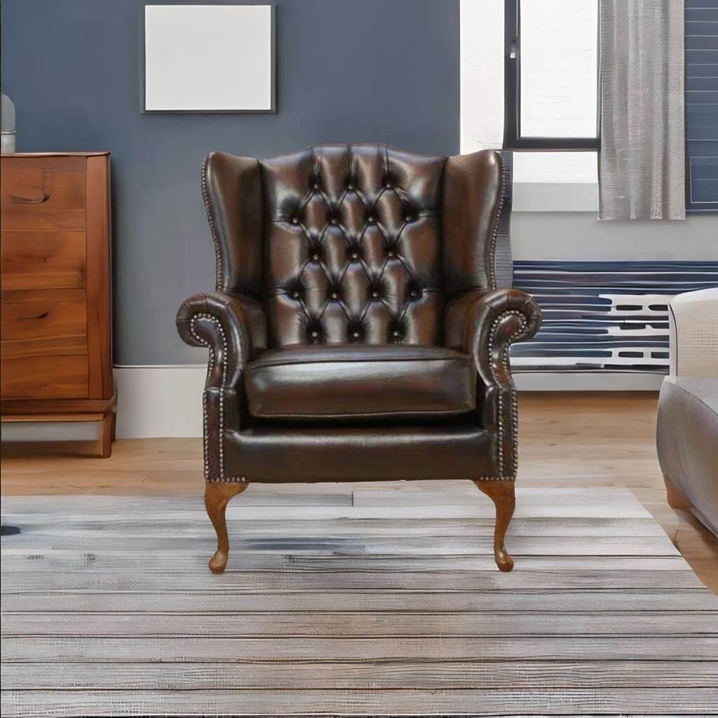 Our winged high-back Chesterfield Queen Anne Armchair with exposed hardwood leg detail. A very popular look in the Queen Anne Style