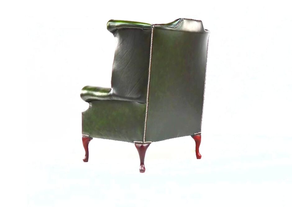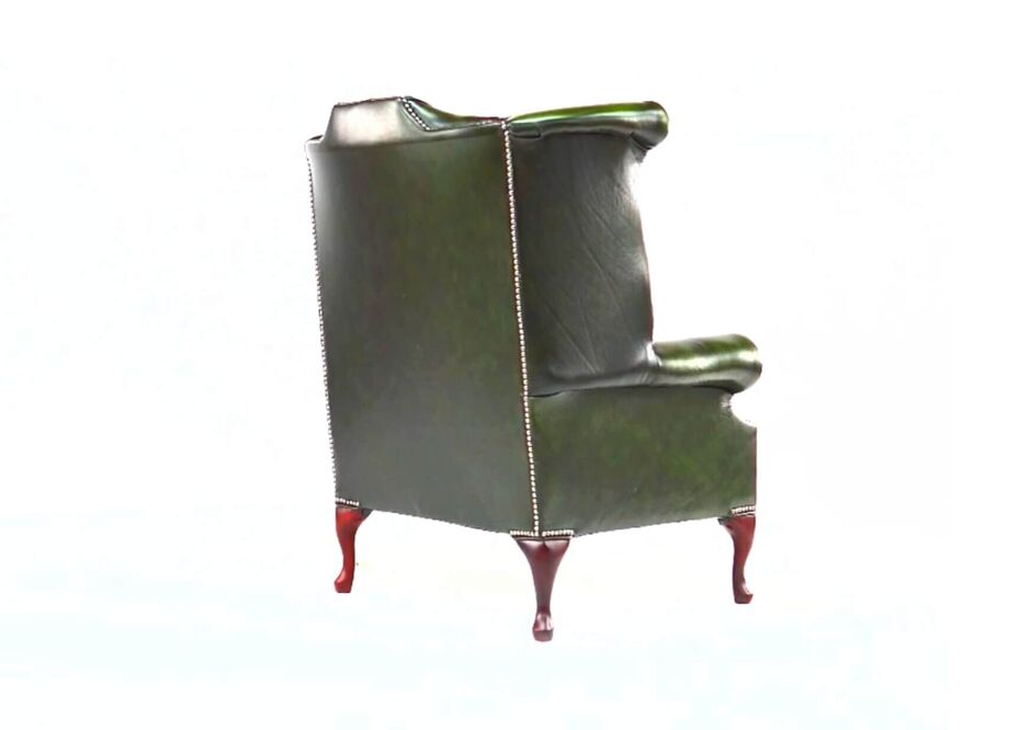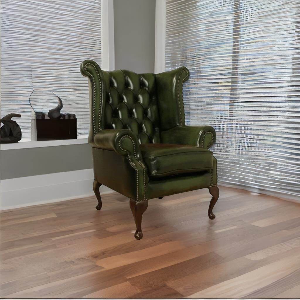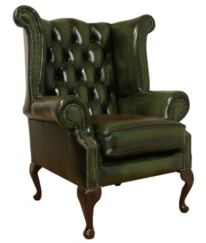 Our classic Winged High-Back Chesterfield Queen Anne Armchair with exposed hardwood leg detail. A very popular look in the Queen Anne style. High Back Chesterfield Queen Anne Wing Chair