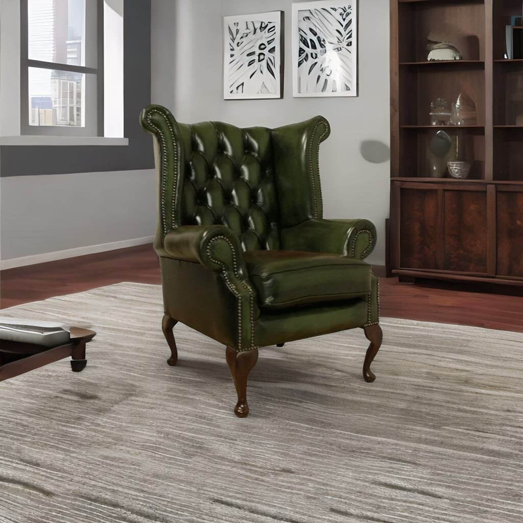 Rub Off Georgian Antique Green Leather Chesterfield Queen Anne Wing Chair | DesignerSofas4U