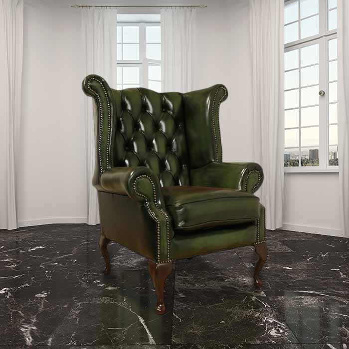 Chesterfield Highclere Flat Wing Queen Anne High Back Wing Chair UK Manufactured Antique Green