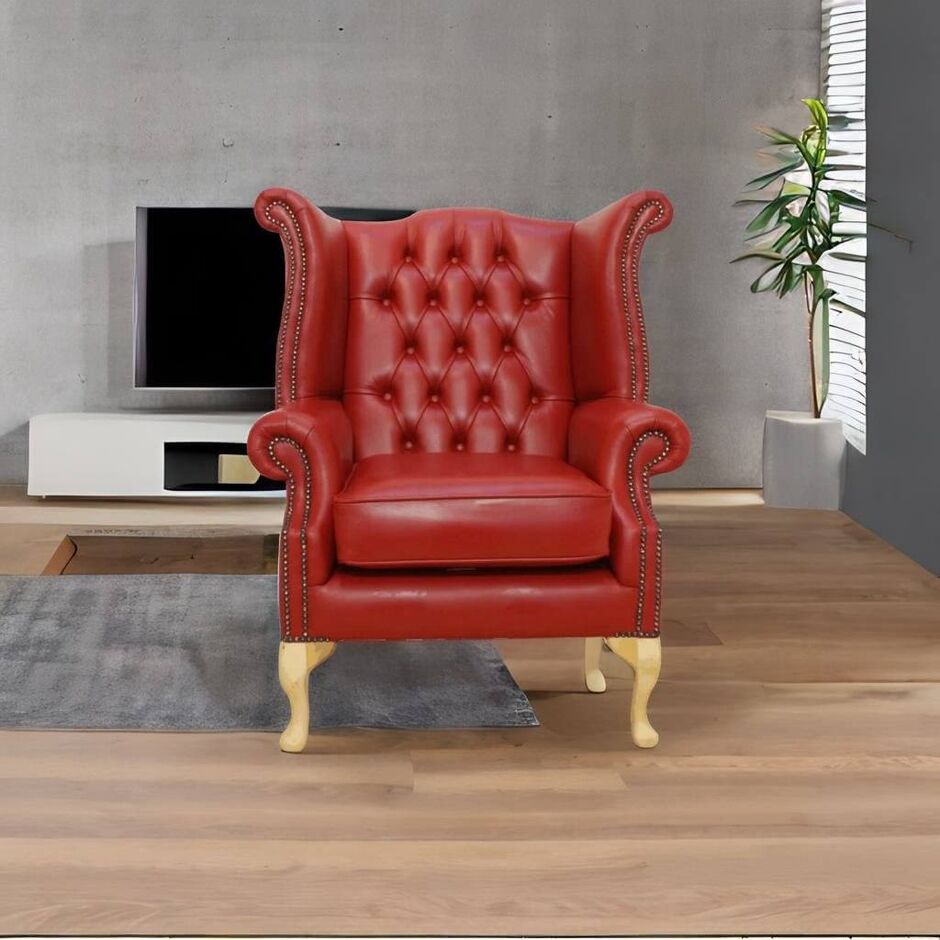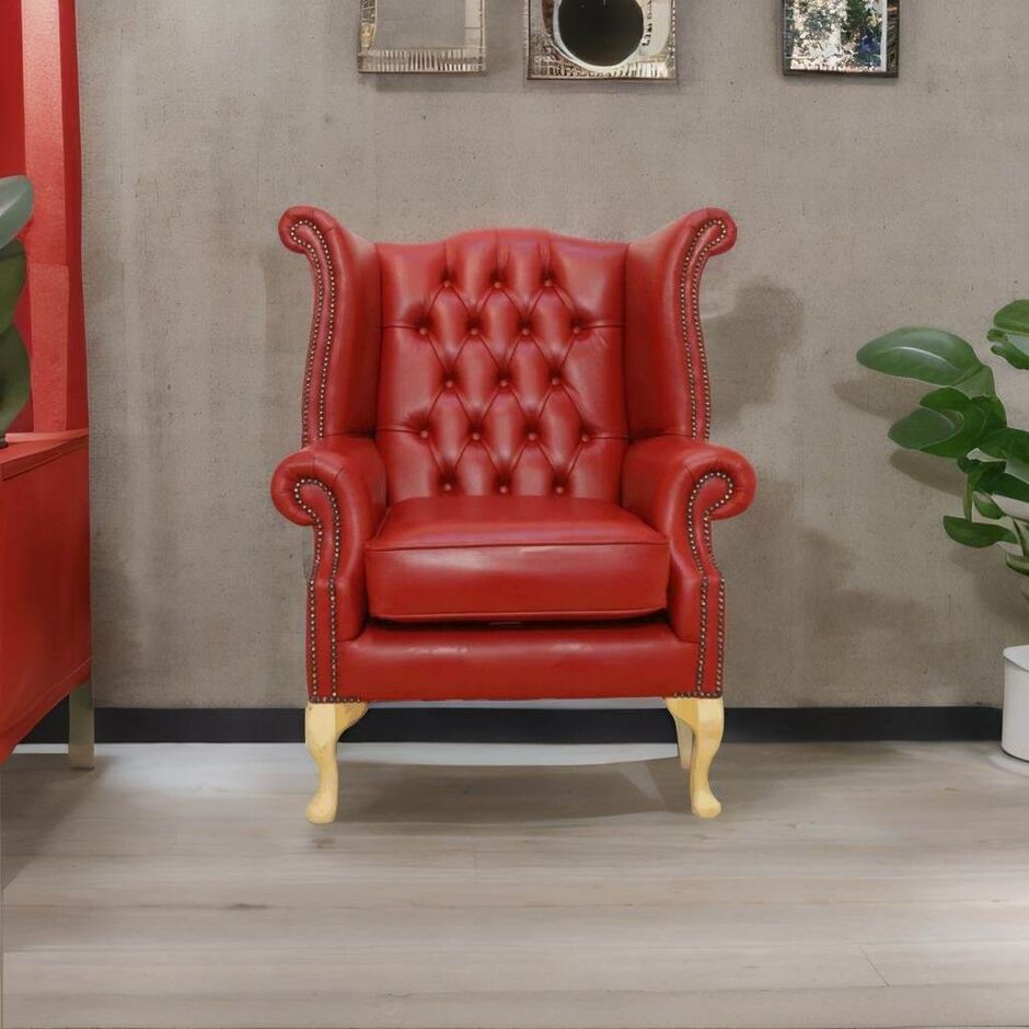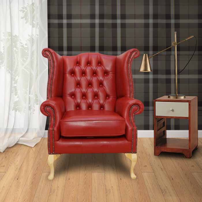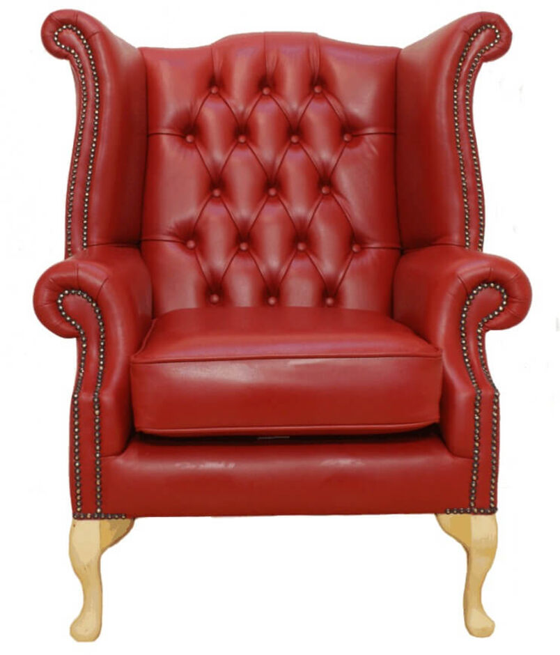 Our classic Winged High-Back Armchair with exposed hardwood leg detail. A very popular look in the Queen Anne style. High Back Chesterfield Queen Anne Wing Chair.