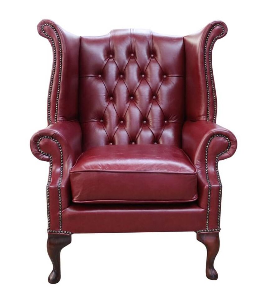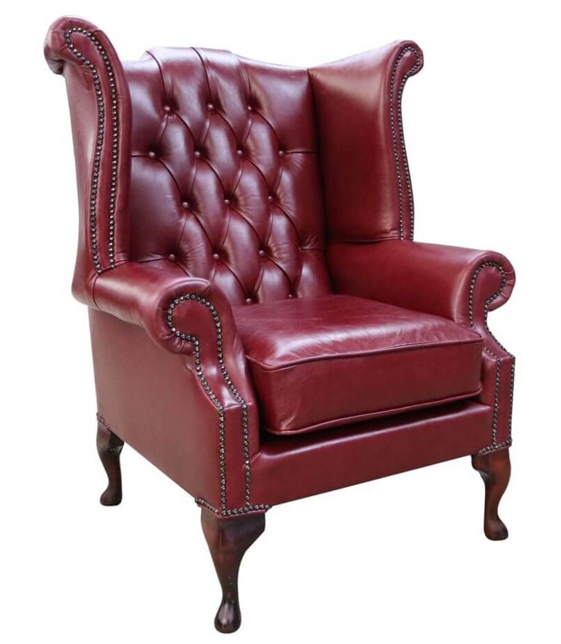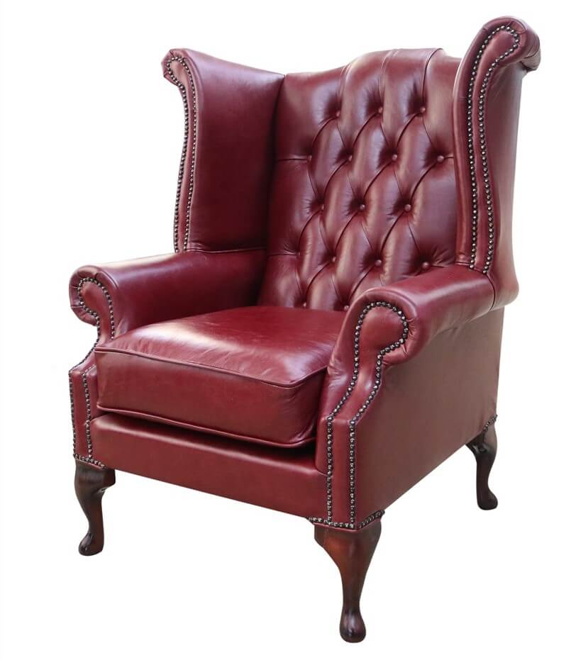 Chesterfield Queen Anne High Back Wing Chair – Old English Burgundy Leather
