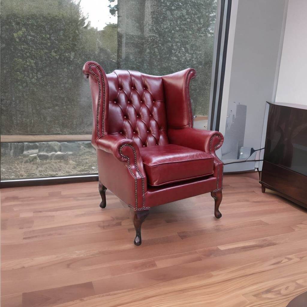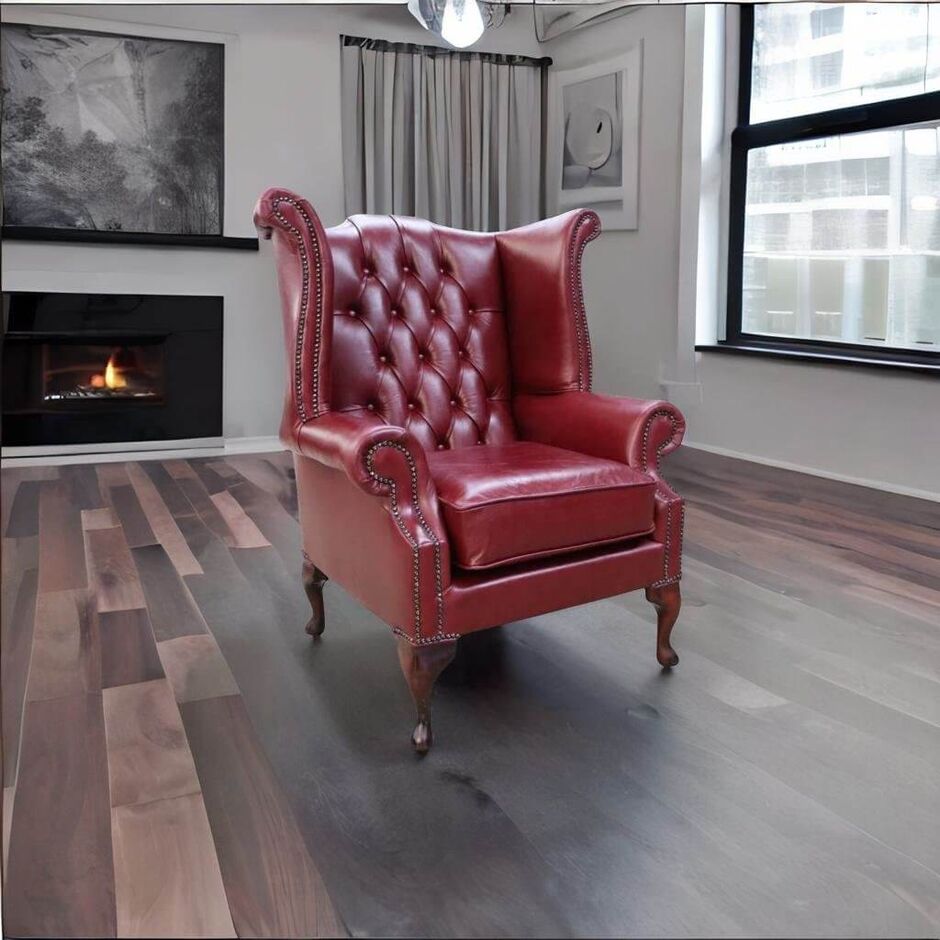 Elevate your interior with timeless sophistication. This Chesterfield Queen Anne Wingback Chair is a UK-manufactured masterpiece, crafted in luxurious Old English Burgundy leather. Featuring a high back, classic deep button tufting, and decorative nailhead trim, this chair exudes elegance and comfort.