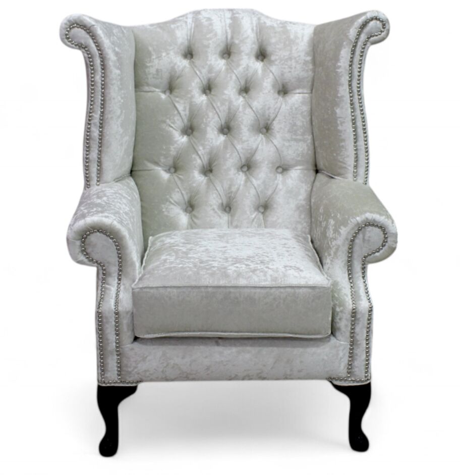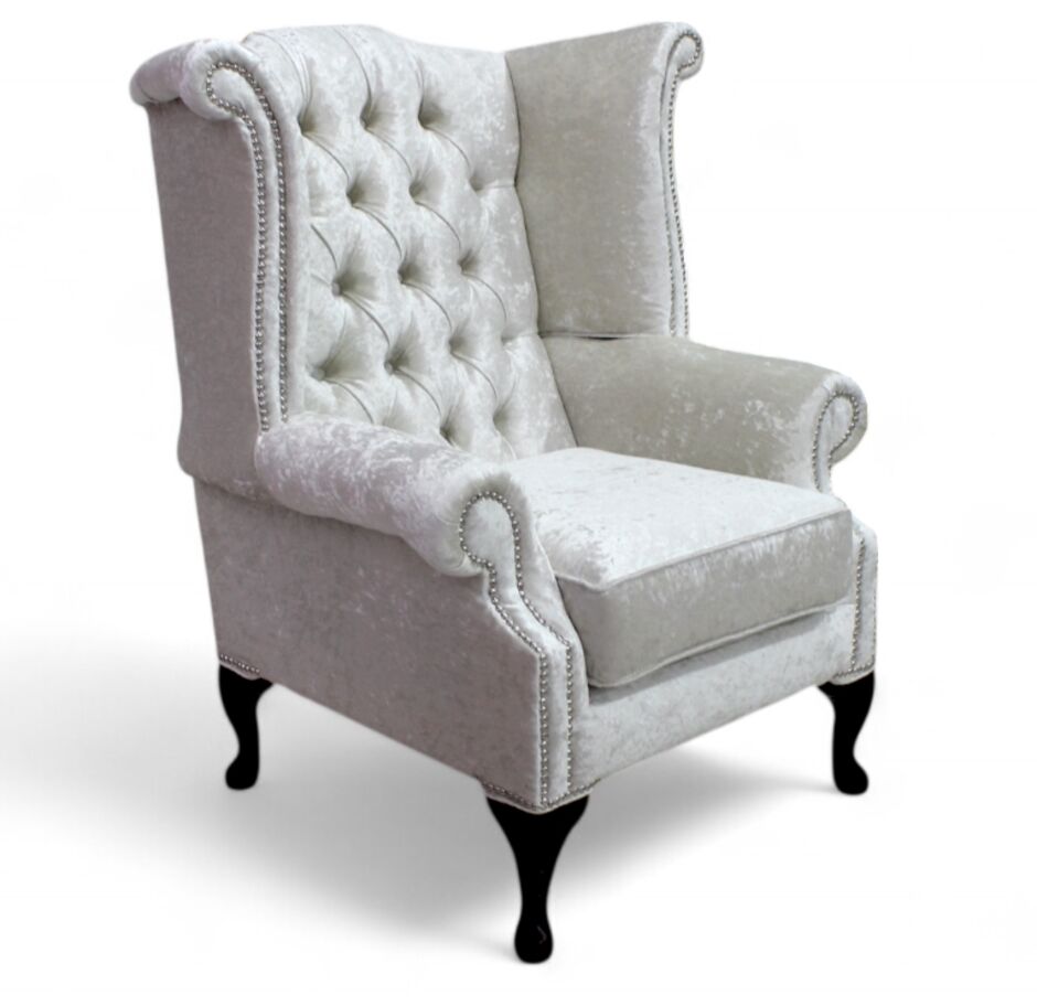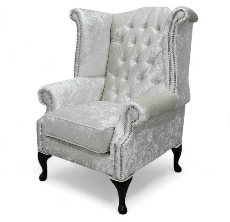 Chesterfield Queen Anne High Back Wing Chair Shimmer Pearl Velvet