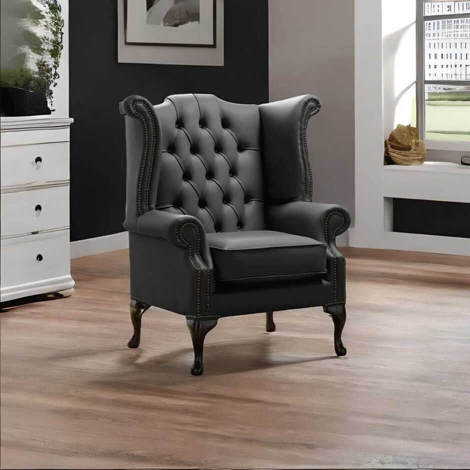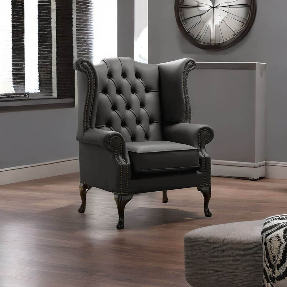 Shelly Black Leather Chesterfield Queen Anne High Back Wing Chair | DesignerSofas4U