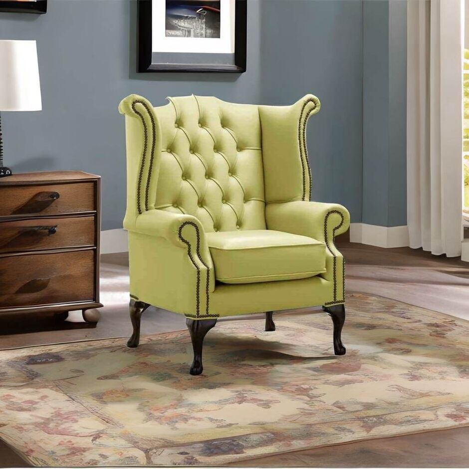 Chesterfield Queen Anne High Back Wing Chair Shelly Field Green Leather