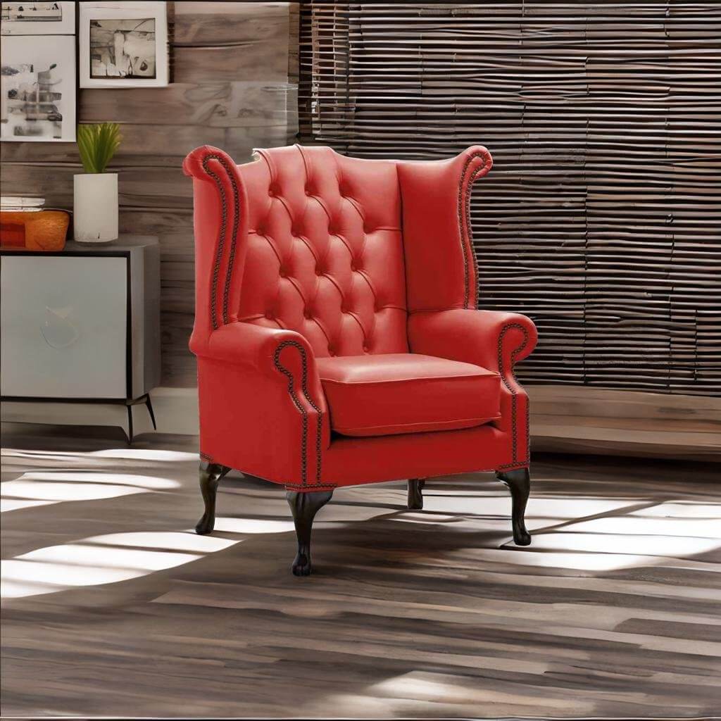 Chesterfield Queen Anne High Back Wing Chair Shelly Flame Red Leather