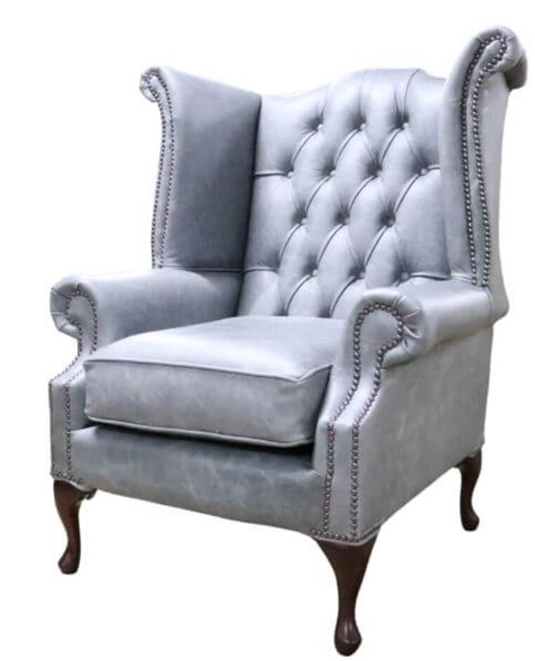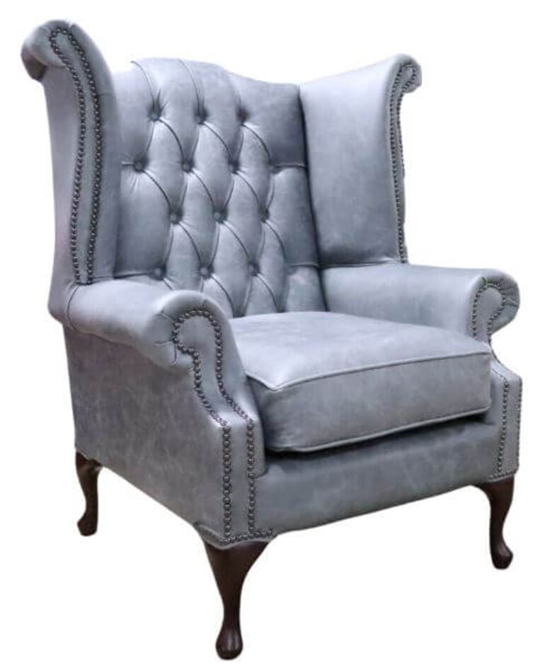 Our classic Winged High-Back Chesterfield Queen Anne Armchair with exposed hardwood leg detail. A very popular look in the Queen Anne style. High Back Chesterfield Queen Anne Wing Chair.