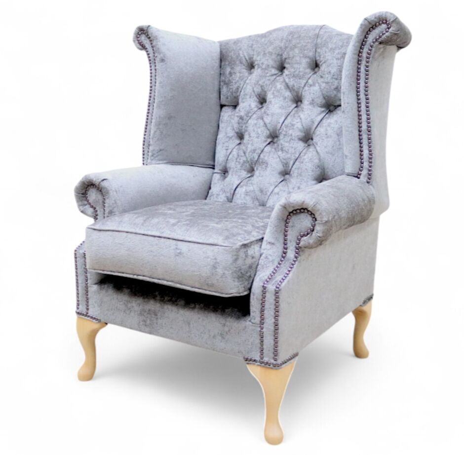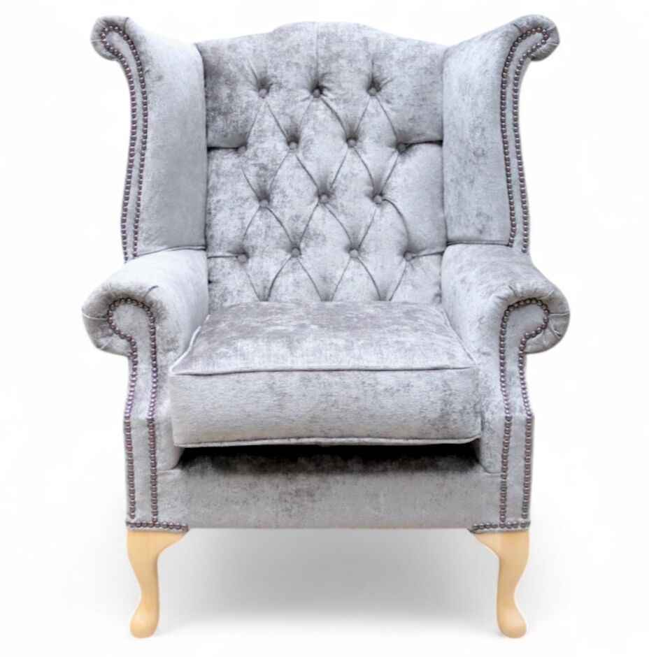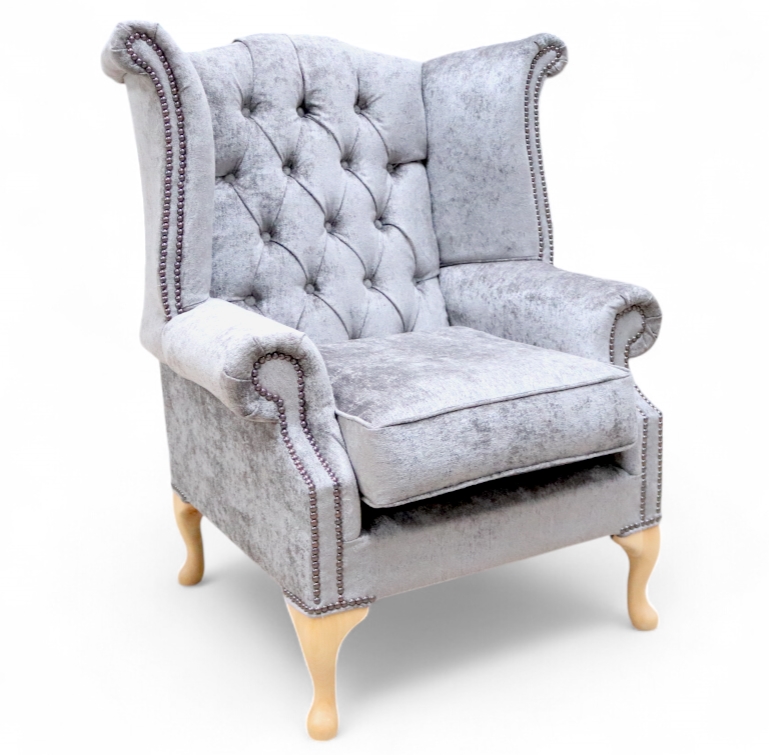 Our Winged High-Back Chesterfield Queen Anne Armchair with exposed hardwood leg detail. A very popular look in the Chesterfield style.