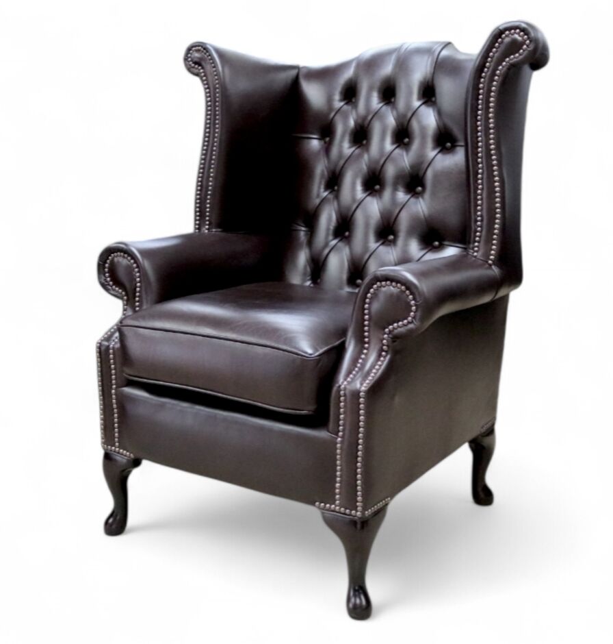 Our winged high-back Chesterfield Queen Anne Armchair with exposed hardwood leg detail. A very popular look in the Queen Anne Style