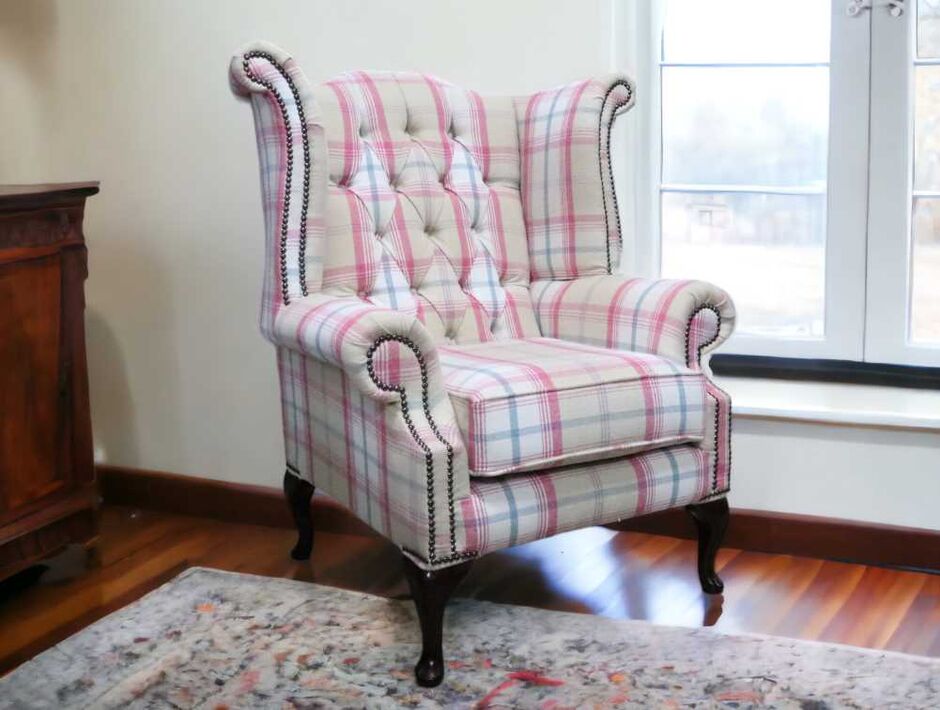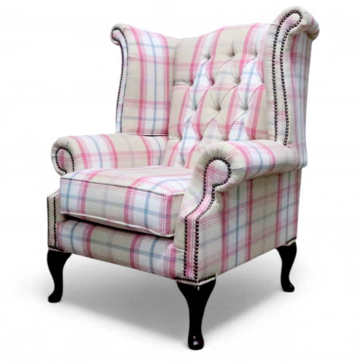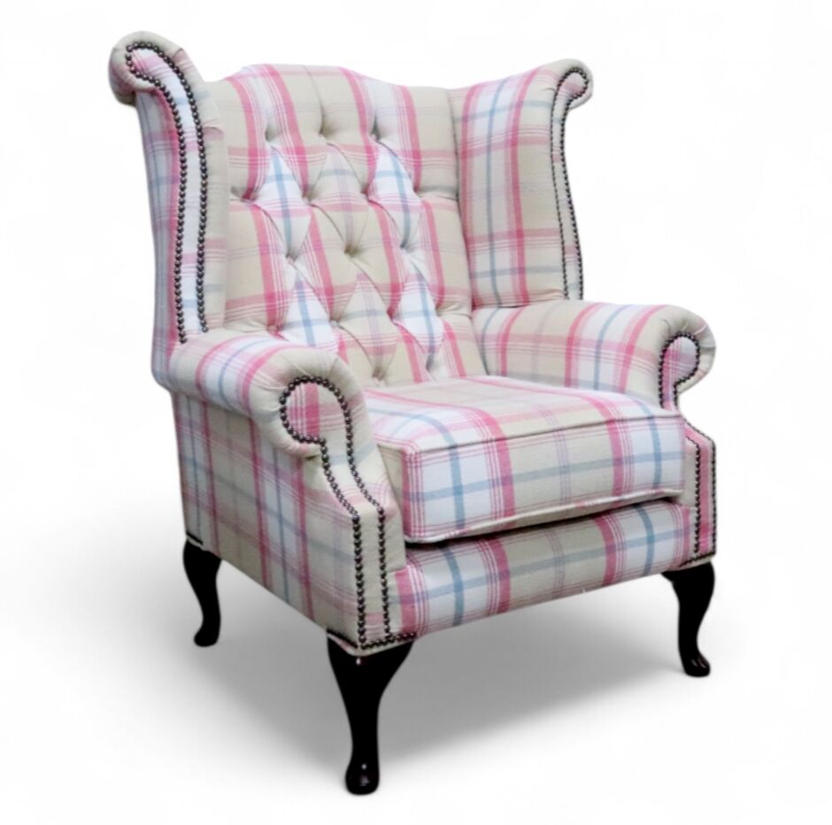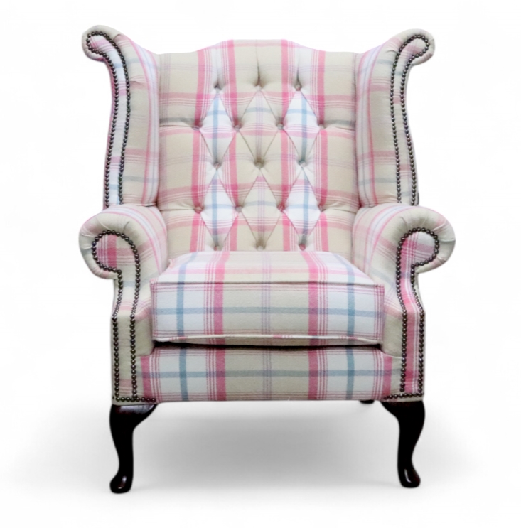 Chesterfield Queen Anne Wing Chair High Back Armchair Balmoral Sorbet Checked Fabric P&S