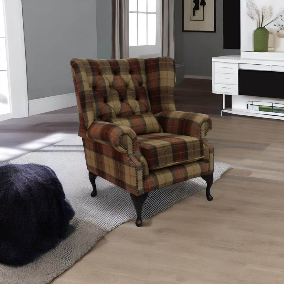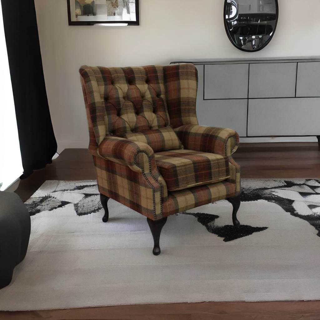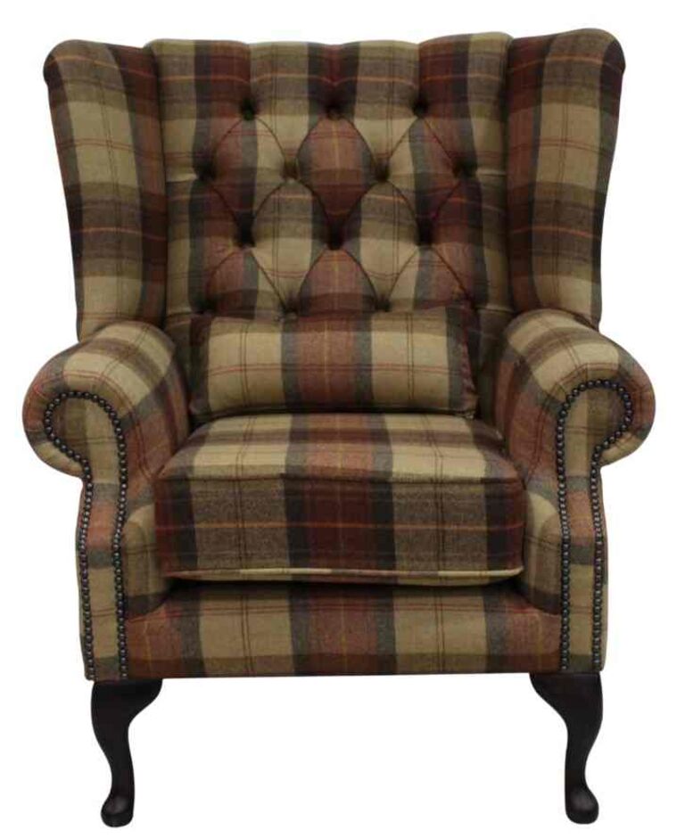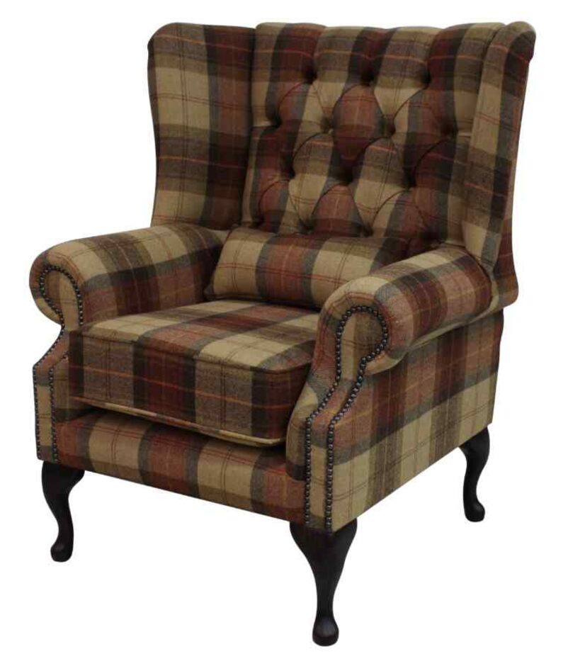 Our Regent Winged High-Back Armchair with exposed hardwood leg detail. A very popular look in the Queen Anne style. High Back Chesterfield Queen Anne Wing Chair. Featuring hardwood Mahogany Queen Anne Legs. Upholstered in Luxurious Designer Wool exclusively available from Designer Sofas4u.