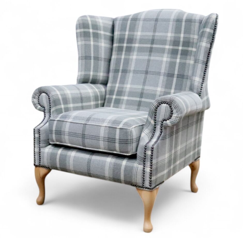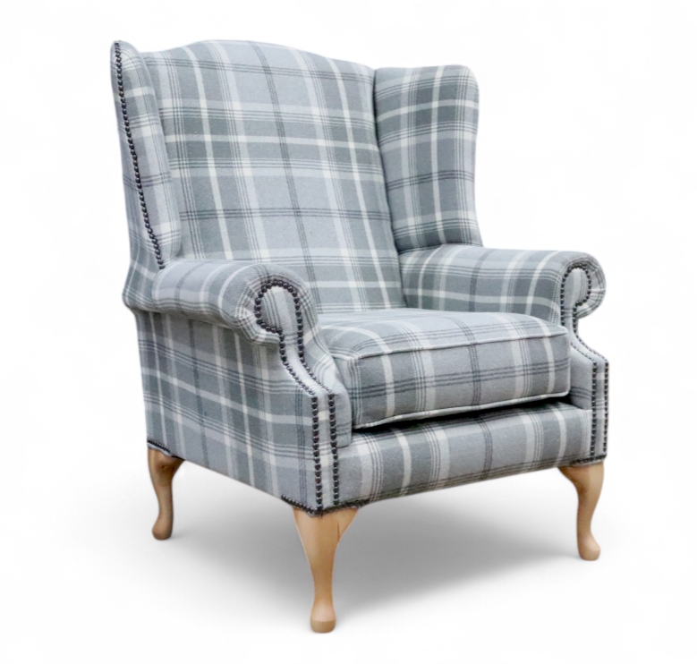 Our classic Winged High-Back Armchair with exposed hardwood leg detail. A very popular look in the Queen Anne style. High Back Chesterfield Queen Anne Wing Chair In Fabric