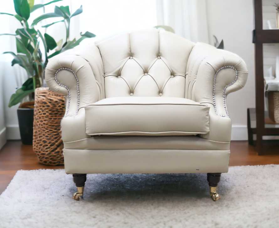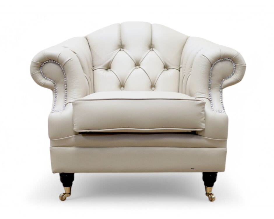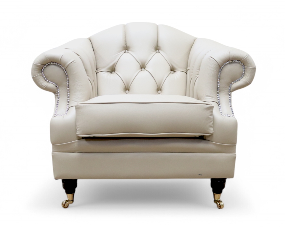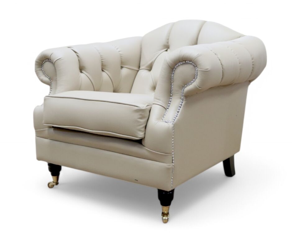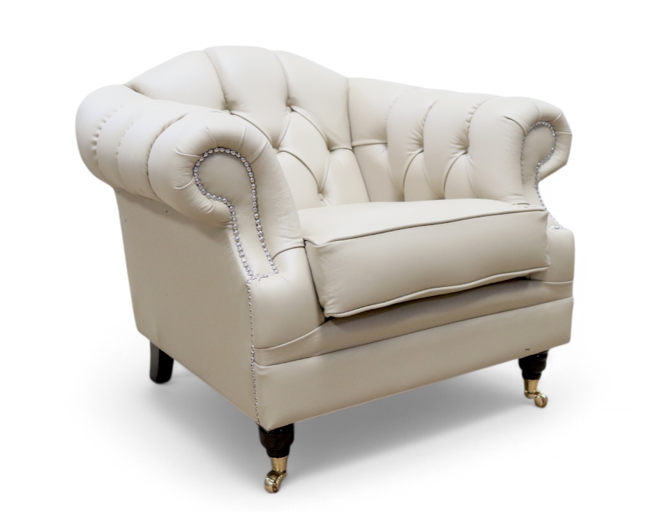 Our Victoria Armchair Chesterfield with exposed hardwood leg detail. A very popular Traditional Piece of furniture