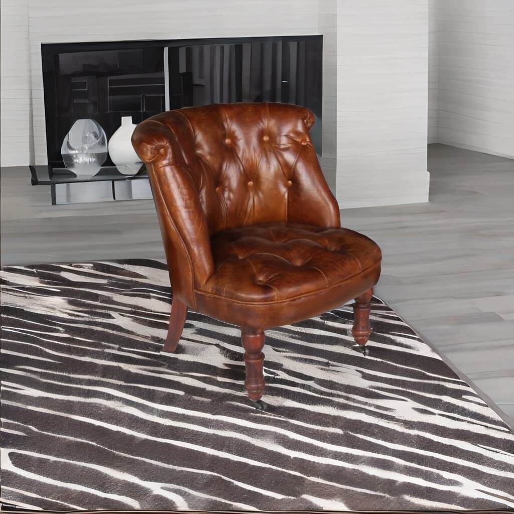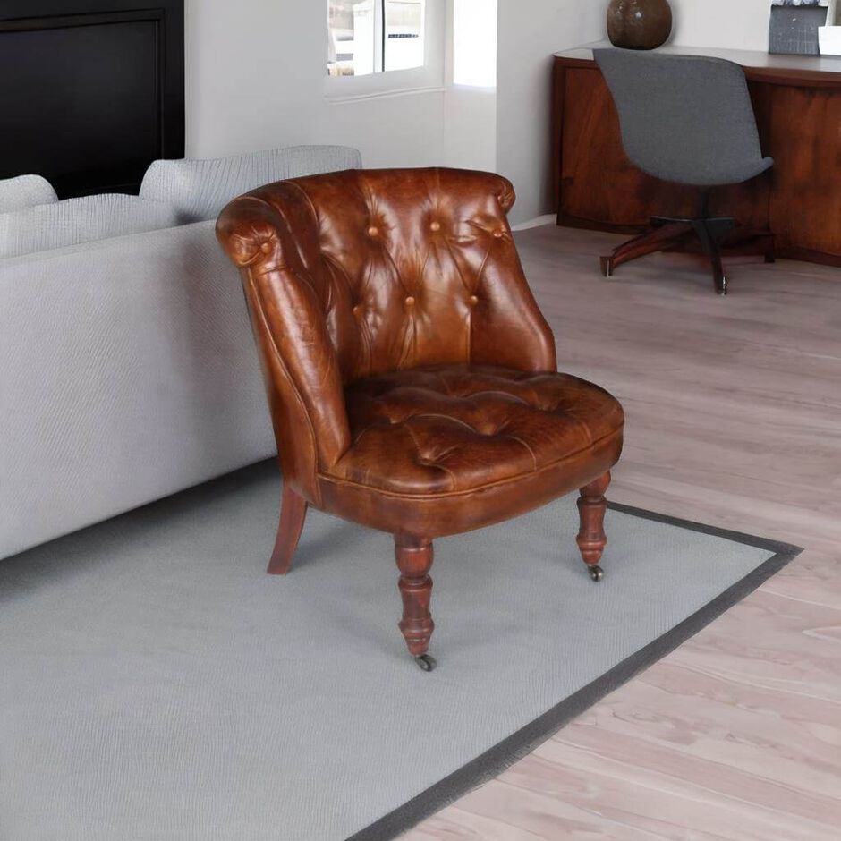 Bring timeless elegance into your home or office with this Vintage Chesterfield Leather Chair. Crafted with genuine, rich brown leather, this chair features deep button tufting, rolled backrest, and turned wooden legs for a sophisticated look. Perfect for adding a touch of luxury to a study, living room, or reading nook.