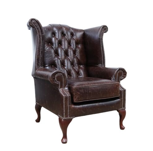 Chesterfield Queen Anne High Back Wing Chair Vintage Tudor Mahogany Leather