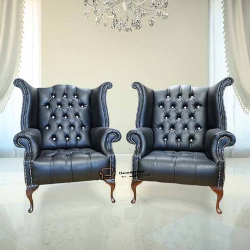 2 x Chesterfield CRYSTALLIZED™ Elements Queen Anne High Back Wing Chair Black Leather