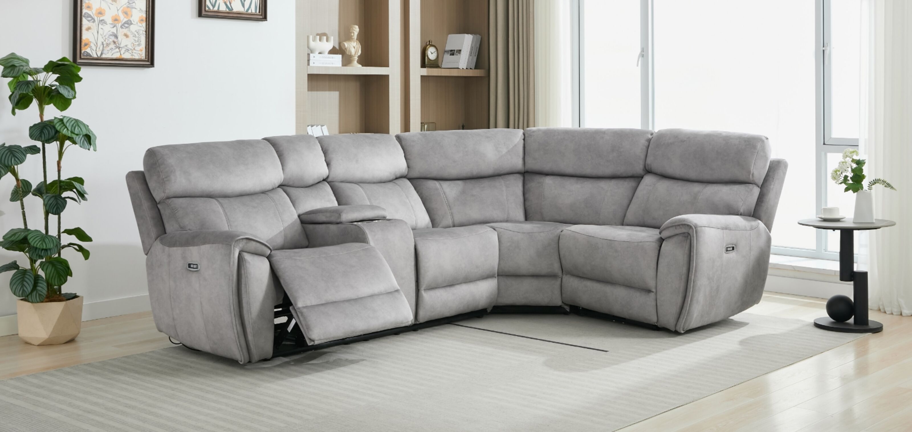 Upgrade your living space with the ultimate in comfort and style. The Dino Corner Reclining Cinema Console Sofa is designed to transform your home into a luxurious relaxation hub. Upholstered in soft, high-quality silver fabric, this modern sectional sofa comfortably seats multiple people and features dual power recliners on each end for personalized lounging.